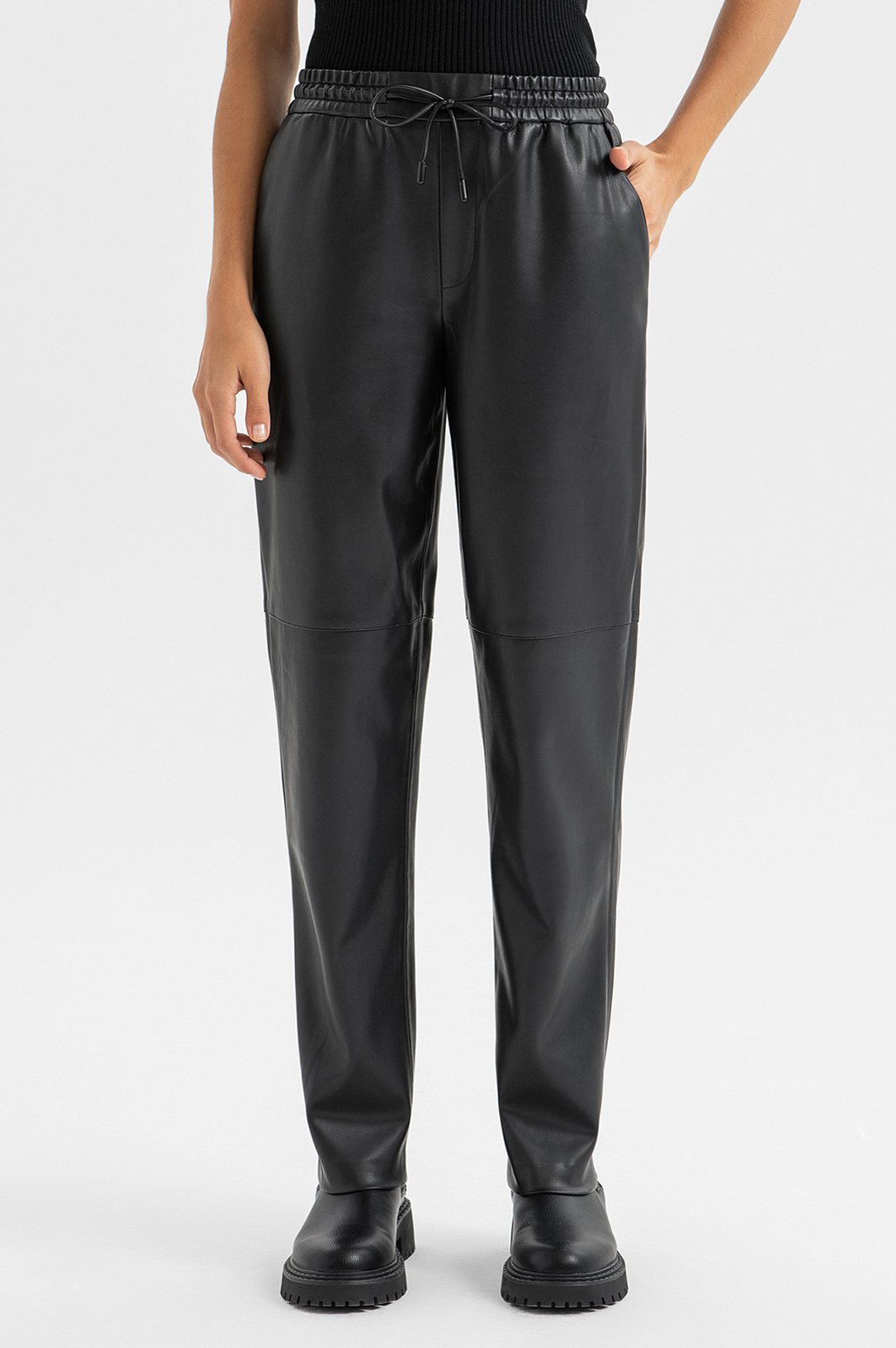 Черные женские брюки KANZLER из мягкой экокожи привнесут в образ нотку дерзости и загадочности. Комфортная модель станет идеальным спутником как на коктейльной вечеринке, так и на прогулке по улицам мегаполиса или встрече с друзьями. Приятный на ощупь матовый материал выглядит благородно. Эластичная резинка и кулиска на поясе обеспечивают идеальную посадку по фигуре. За брюками легко ухаживать – достаточно протереть поверхность влажной тканевой салфеткой. Модель можно дополнить черной рубашкой из того же материала, топом и грубыми ботинками или парой туфель на высоком каблуке. Параметры модели: рост 175, 86-62-92 Размер на модели: S