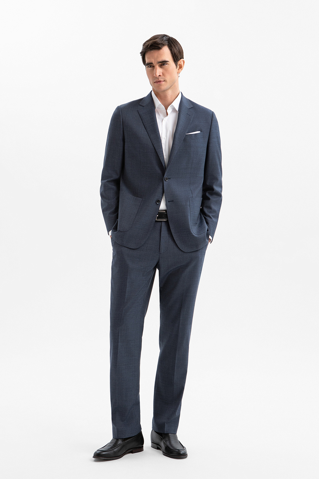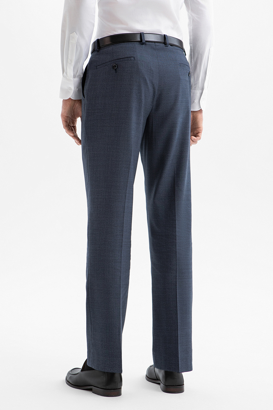 Брюки KANZLER из мягкой шерсти мериноса спокойного синего цвета адресованы адептам сдержанной роскоши и безупречного кроя. Если дополнить их пиджаком KANZLER из этой же ткани, получается выверенный и статусный костюм для деловых выходов, в котором каждая деталь работает на образ безупречной мужской элегантности. В более свободных сочетаниях — с сорочкой или тонким трикотажем — брюки подойдут для ужина в ресторане и светских встреч. Слегка зауженный силуэт подчёркивает линию ног, формируя собранный, уверенный образ, а чёткие стрелки придают фигуре стройность. Тонкая костюмная ткань Супер 120S сделана из драгоценной шерсти мериноса. Она приятно облегает тело и сохраняет ощущение комфорта на протяжении всего дня. Водоотталкивающая обработка защищает брюки от капризов погоды и помогает сохранить безупречный вид в поездках и путешествиях.