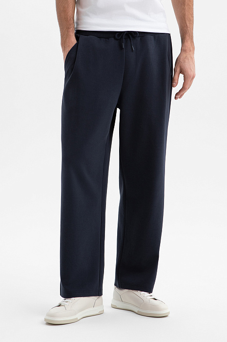 Спортивные брюки из мягкого хлопкового трикотажа — идеальный выбор для комфорта на каждый день. Они подойдут для спортивных занятий и расслабленного отдыха. Универсальный темно-синий оттенок легко сочетается с футболками, худи и свитшотами. Однотонные лампасы подчёркивают спортивный характер модели. Свободный крой обеспечивает легкость движений и удобную посадку, а эластичный пояс на кулиске позволяет регулировать объем по линии талии. Приятная к телу ткань произведена из хлопка с добавлением полиэстера и спандекса. Такое сочетание делает трикотаж мягким, дышащим, прочным и эластичным.