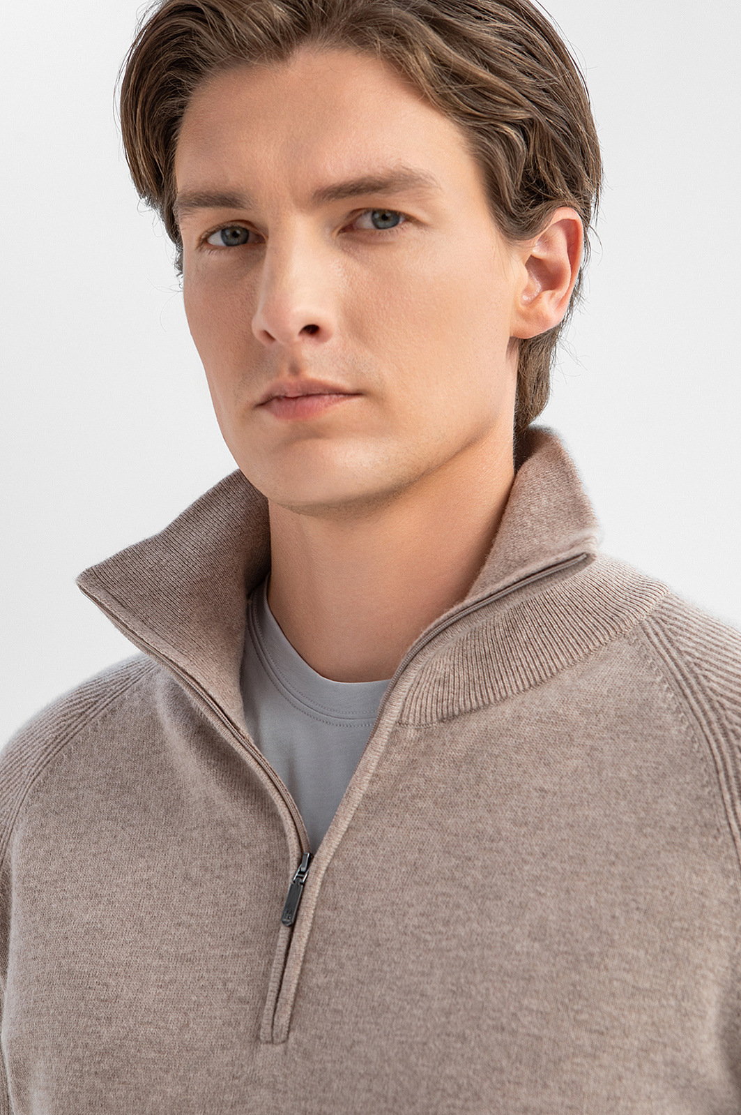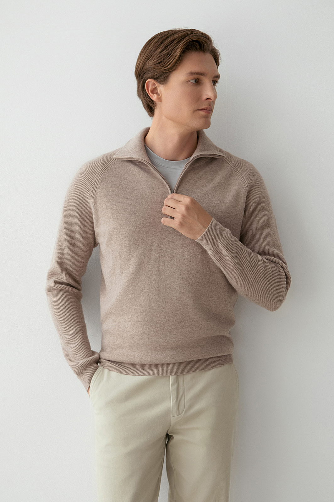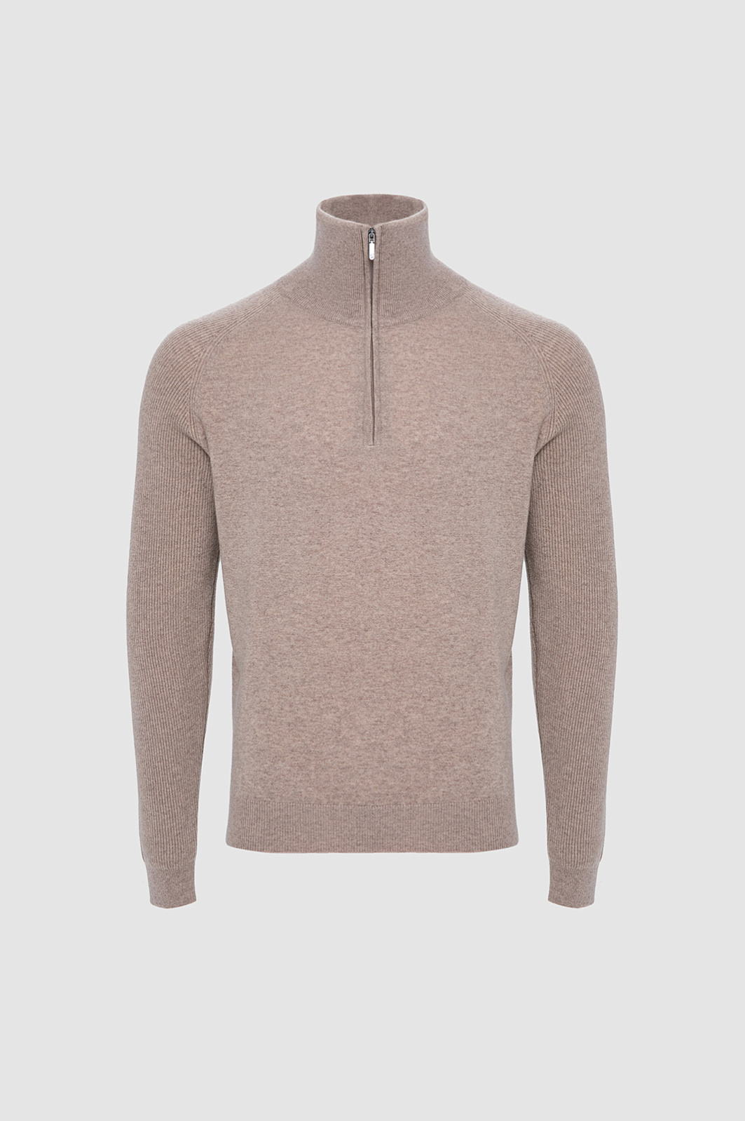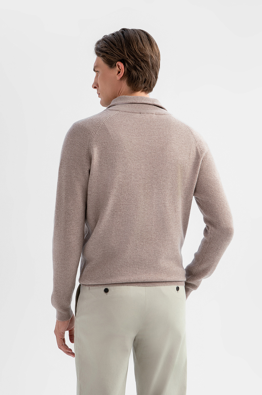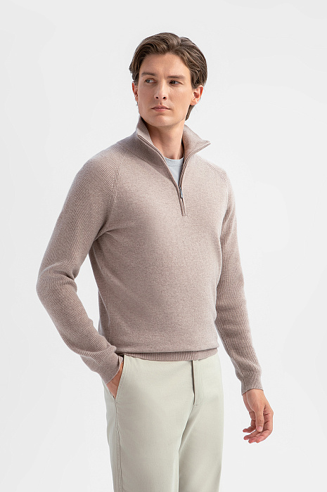 Бежевый джемпер KANZLER – воплощение сдержанной роскоши, подчеркивающей статус и чувство стиля. Особенность модели – сочетание двух видов фактур: основная часть выполнена гладкой вязкой, а рукава – деликатным рубчиком, что создает интересный визуальный контраст. Воротник-стойка на молнии позволяет одним движением руки менять образ и регулировать комфортную температуру, защищая шею от ветра в прохладный день. Материал – роскошный микс натуральных волокон: шерсть высокого качества (90%) обеспечивает терморегуляцию, а добавка драгоценного кашемира (10%) придает мягкость и нежную фактуру, улучшая тактильные ощущения. Параметры модели: рост 191, 97-77-99 Размер на модели: M