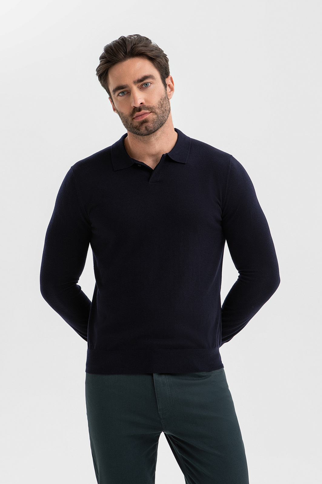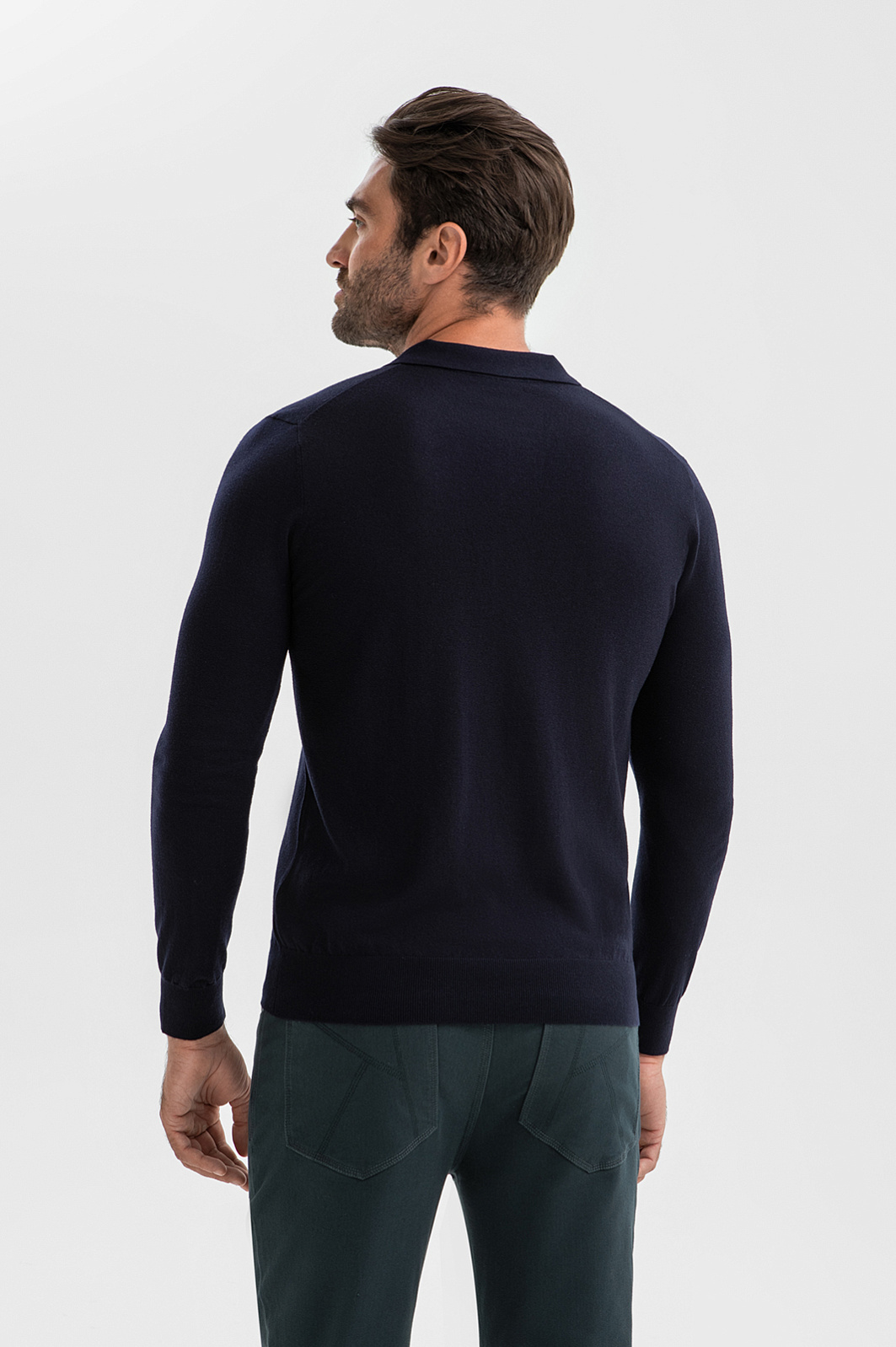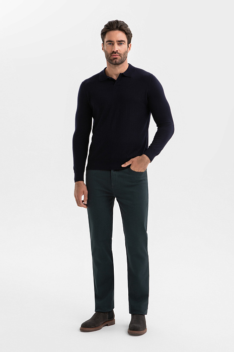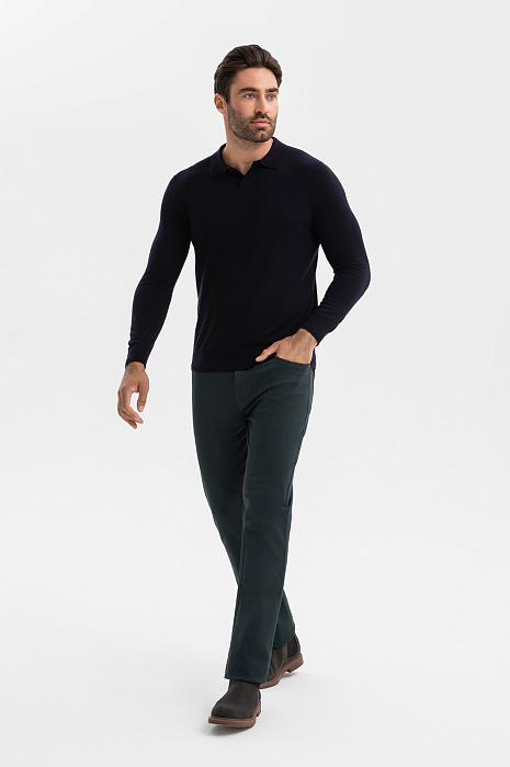 Джемпер поло KANZLER в глубоком темно-синем оттенке создает образ уверенного мужчины, который будет одинаково органично смотреться и в офисе, и на вечернем мероприятии. Состав – формула практичной роскоши: натуральная шерсть высочайшего качества (95%) обеспечивает терморегуляцию и устойчивость к сминанию, а добавка кашемира (5%) придает материалу шелковистую фактуру и благородное сияние. Плотная вязка держит безупречную форму, подчеркивая силуэт без стеснения движений. Отложной воротник застегивается на пуговицу. Параметры модели: рост 192, 108-83-102 Размер на модели: M