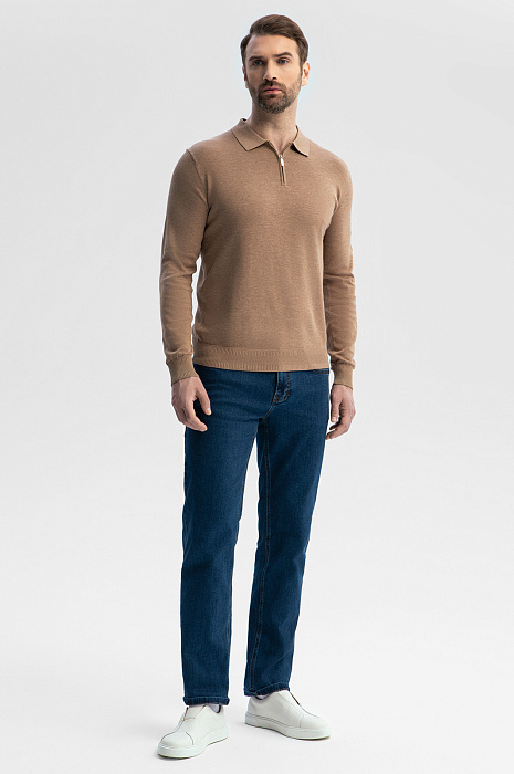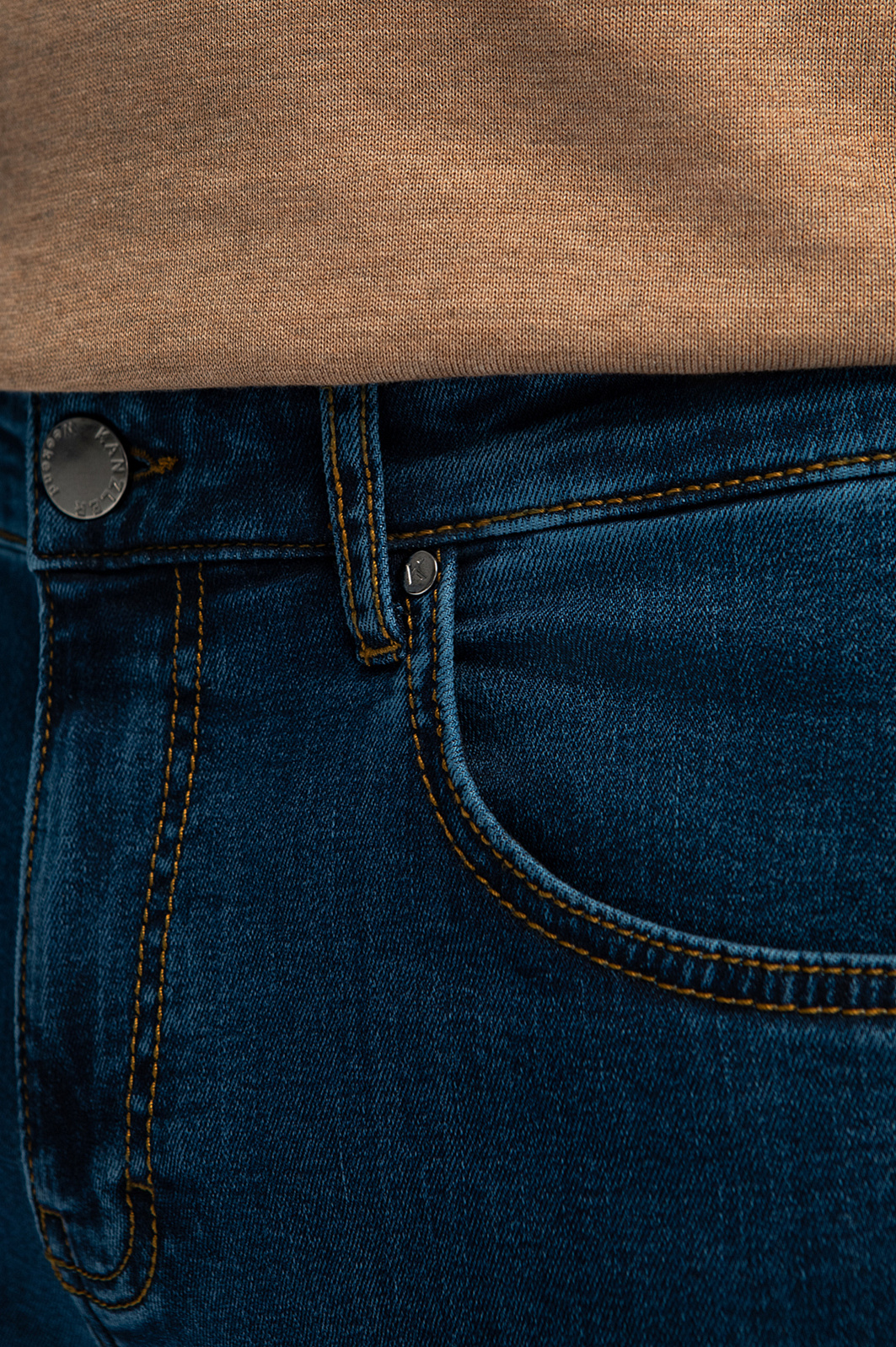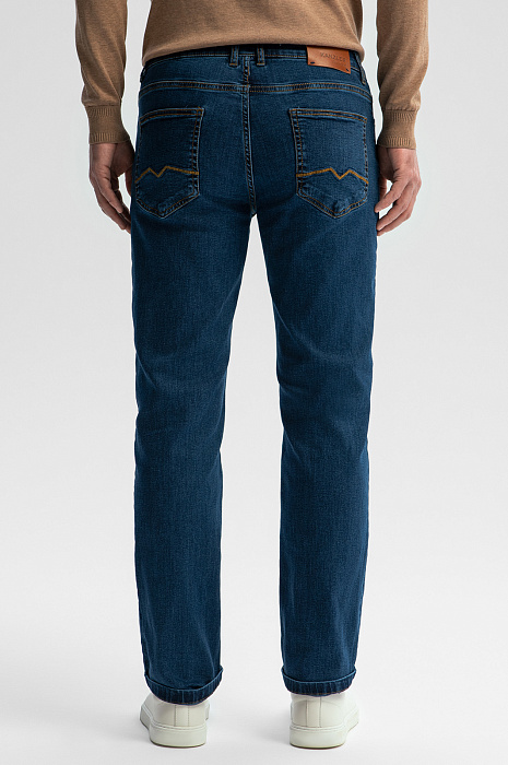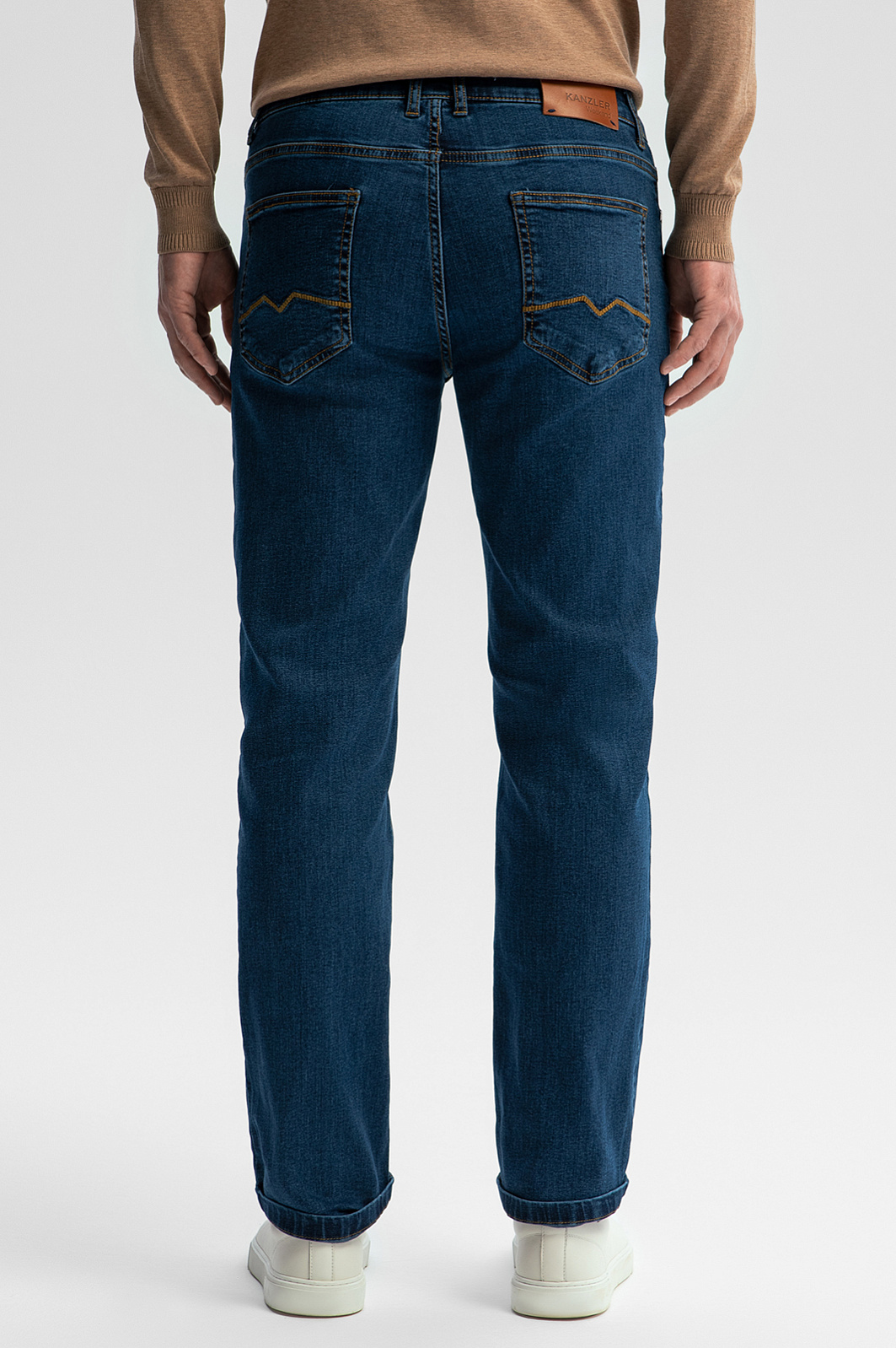 Классические джинсы KANZLER из синего денима — удобная базовая модель, которую приятно носить на работе в офисе с нестрогим дресс-кодом и в свободное время. Модель прямого кроя с пятью карманами отличается комфортной посадкой. На фоне синего плотного денима выделяются коричневые традиционные джинсовые швы и декоративные прострочки на задних карманах. Качественный деним произведен из гипоаллергенного дышащего хлопка (98%) с добавлением эластана (2%). Такое сочетание делает ткань очень практичной — прочной, устойчивой к износу и растяжению. Параметры модели: рост 189, 102-80-99 Размер на модели: 34
