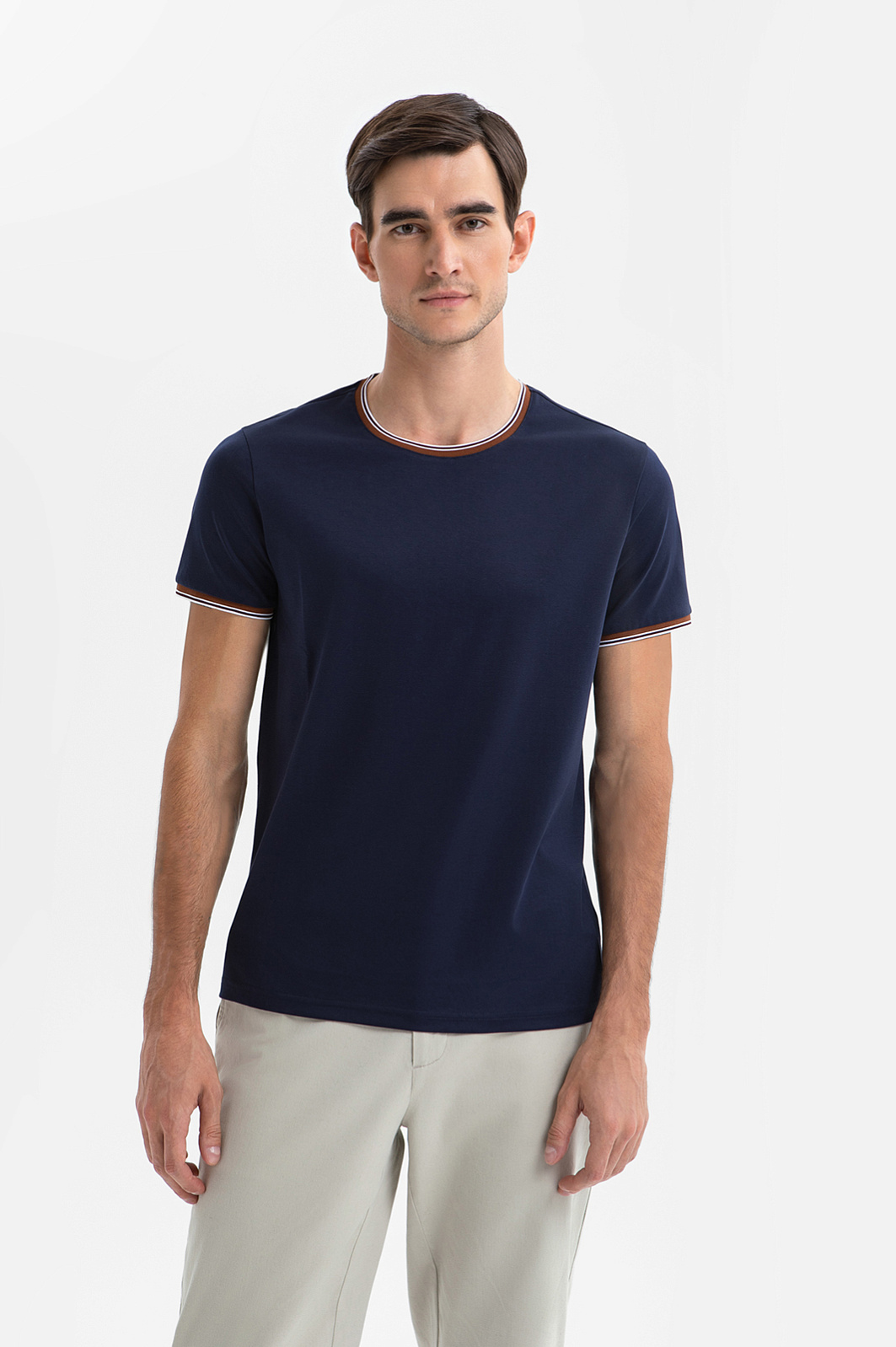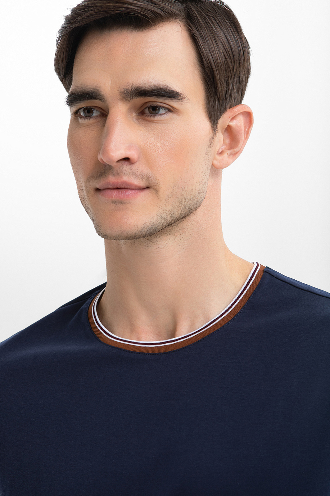 Стильная футболка KANZLER из чистого хлопка в насыщенном синем цвете с классическим круглым вырезом — образец современного минимализма с элементами ретрошика. Контрастная отделка рукавов и выреза горловины коричнево-белой тесьмой отсылает к эстетике 70-х, добавляя вещи винтажный шарм. Силуэт подчёркивает фигуру, создавая динамичный образ, который легко адаптируется как к спортивному, так и к городскому стилям. Футболка создана из качественного натурального трикотажа. Гипоаллергенный воздухопроницаемый мерсеризованный хлопок (100%) хорошо отводит влагу и обеспечивает комфорт в любую погоду. Параметры модели: рост 192, 101-76-97 Размер на модели: M