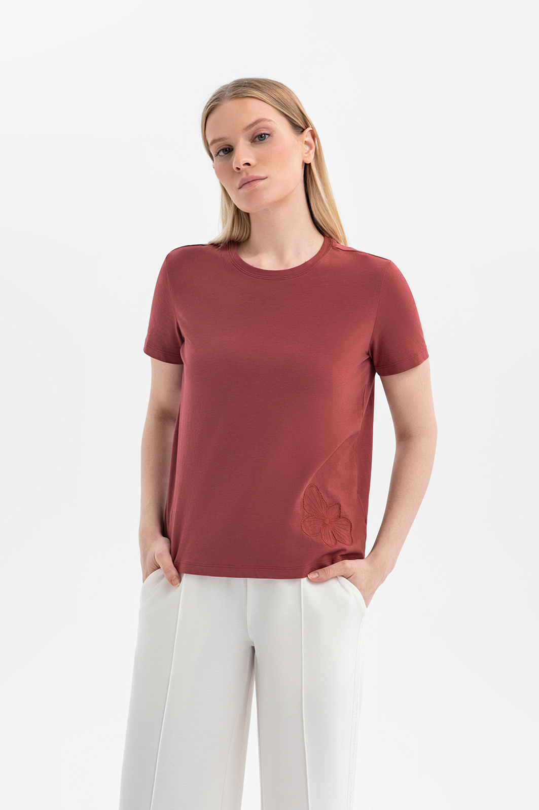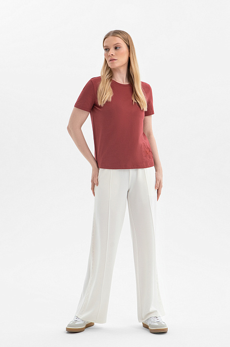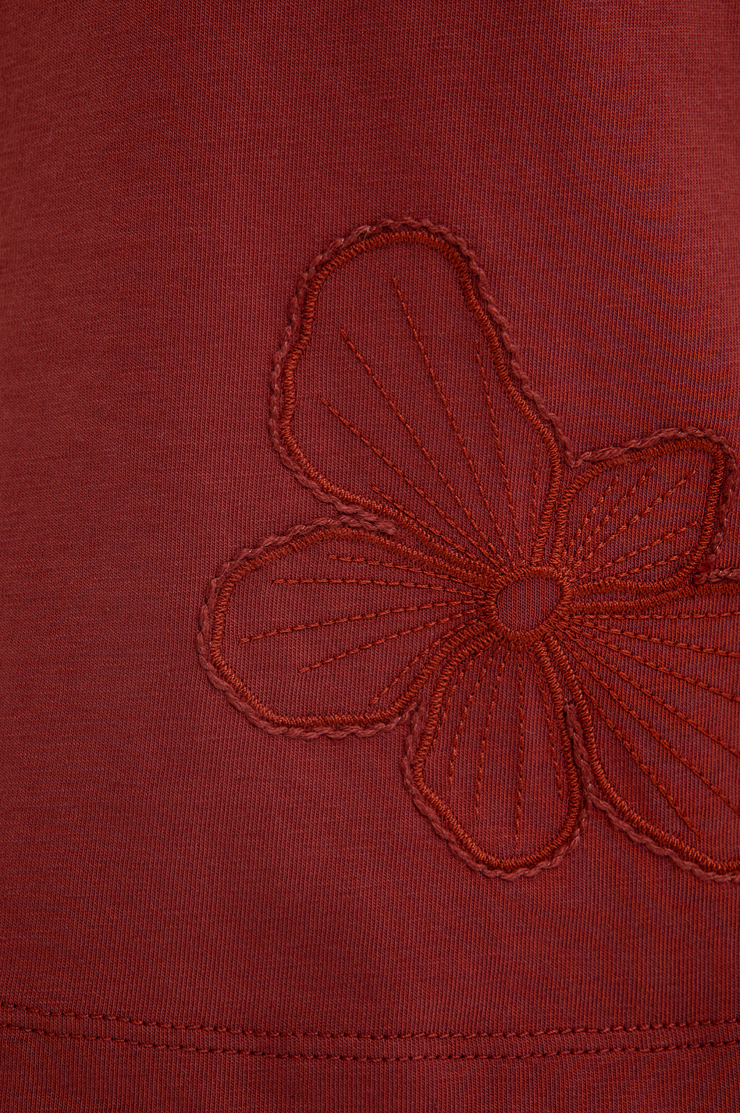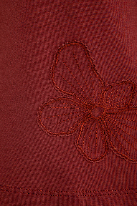 Футболка KANZLER из хлопка — практичная и стильная база гардероба, которая легко сочетается с вещами в повседневном стиле. Бордово-коричневый оттенок придаёт образу чувственность и теплоту. Переднюю часть украшает изящная цветочная вышивка, которая добавляет романтичный, но ненавязчивый декоративный штрих, и делает модель выразительной. Высококачественный трикотаж из гипоаллергенного хлопка с добавлением спандекса отличается воздухопроницаемой структурой и лёгкой эластичностью. Такая ткань мягко облегает тело, поддерживает ощущение свежести и хорошо сохраняет форму.