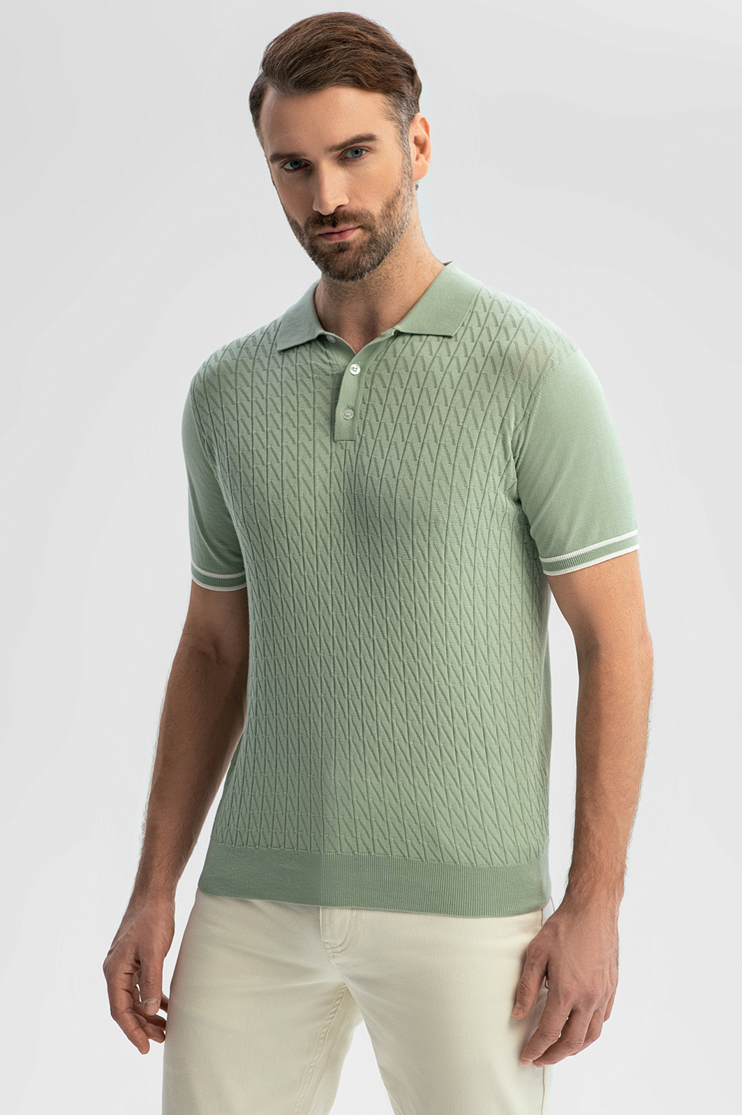 Поло KANZLER в благородном оливковом оттенке — симбиоз утонченного стиля и комфорта. Для создания модели выбрали премиальный хлопок Пима — уникальный материал, обладающий повышенной прочностью, легкостью и шелковистой фактурой. Мягкие гипоаллергенные волокна сохраняют цвет и форму на протяжении долгого времени — благодаря долговечности поло станет инвестицией в гардероб. Изысканный фактурный узор придает модели глубину и индивидуальность. Вертикально направленные полосы формируют стройный силуэт и визуально вытягивают фигуру. Дополните модель светлыми брюками для создания запоминающегося образа. Параметры модели: рост 189, 102-80-99 Размер на модели: M