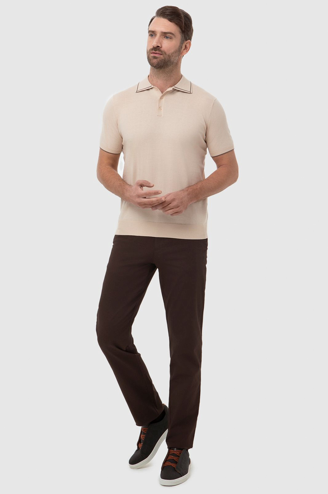 Роскошное поло KANZLER оттенка крем-брюле поможет создать неотразимый образ, в котором сочетаются стиль, комфорт и непринужденность. Тонкая коричневая полоска на воротнике и манжетах добавляет модели изысканности. В союзе с поло любая повседневная одежда для отдыха — джинсы, слаксы — преображается, становясь элегантной. Модель имеет классический крой и традиционные детали — три пуговицы на планке и мягкий отложной воротник. Мягкое джерси из дорогого стопроцентного хлопка великолепно смотрится на любом типе фигуры. Натуральные волокна пропускают воздух и отводят лишнюю влагу, создавая ощущение комфорта во время отдыха, подвижных игр и прогулок. Параметры модели: рост 189, 102-80-99 Размер на модели: M