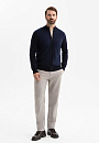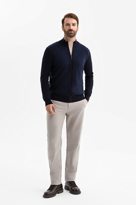 Кардиган KANZLER на молнии в синем оттенке воплощает сдержанную элегантность, комфорт и современный минимализм. Глубокий тёмно-синий оттенок легко вписывается как в деловой, так и в повседневный гардероб, создавая образ уверенного и стильного мужчины. Лаконичный дизайн подчёркнут трикотажными резинками, которые формируют аккуратный силуэт, добавляют удобства и сохраняют форму кардигана даже при активной носке. Функциональная молния дополнена небольшим язычком из белого металла, который служит деликатным акцентом. Кардиган выполнен из гладкого эластичного шерстяного трикотажа (100%), который обеспечивает мягкость и тепло и сохраняет безупречный внешний вид. Параметры модели: рост 189, 102-80-99 Размер на модели: M