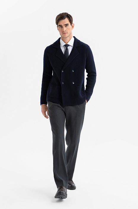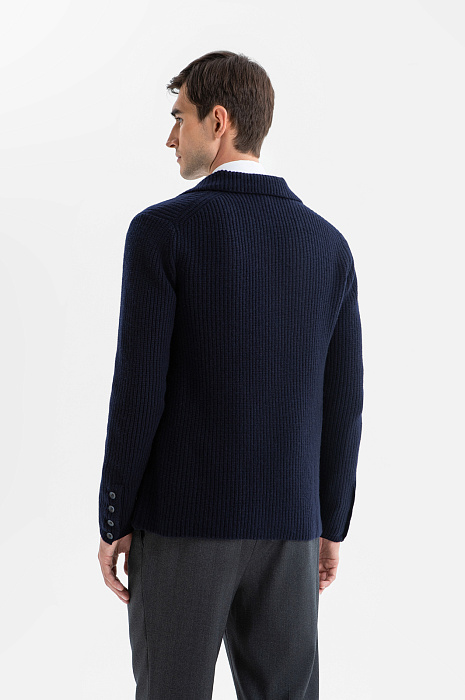 Роскошный кардиган из чистой шерсти KANZLER синего оттенка сочетает элегантность классического пиджака и уют вязаной вещи. Это универсальный элемент гардероба, который легко сочетается с рубашкой и брюками для офиса или с джинсами и джемпером для непринуждённого образа. Модель выполнена в форме двубортного пиджака. Мягкий аккуратный отложной воротник и накладные карманы добавляют лёгкой небрежности. На рукавах — ряд пуговиц, которые подчёркивают внимание к деталям. Выразительная фактура в плотный рубчик подчёркивает глубину синего цвета и придаёт кардигану брутальный характер. Пряжа из натуральной шерсти (100%) делает вещь теплой, дышащей и устойчивой к сминанию. Параметры модели: рост 192, 101-76-97 Размер на модели: M