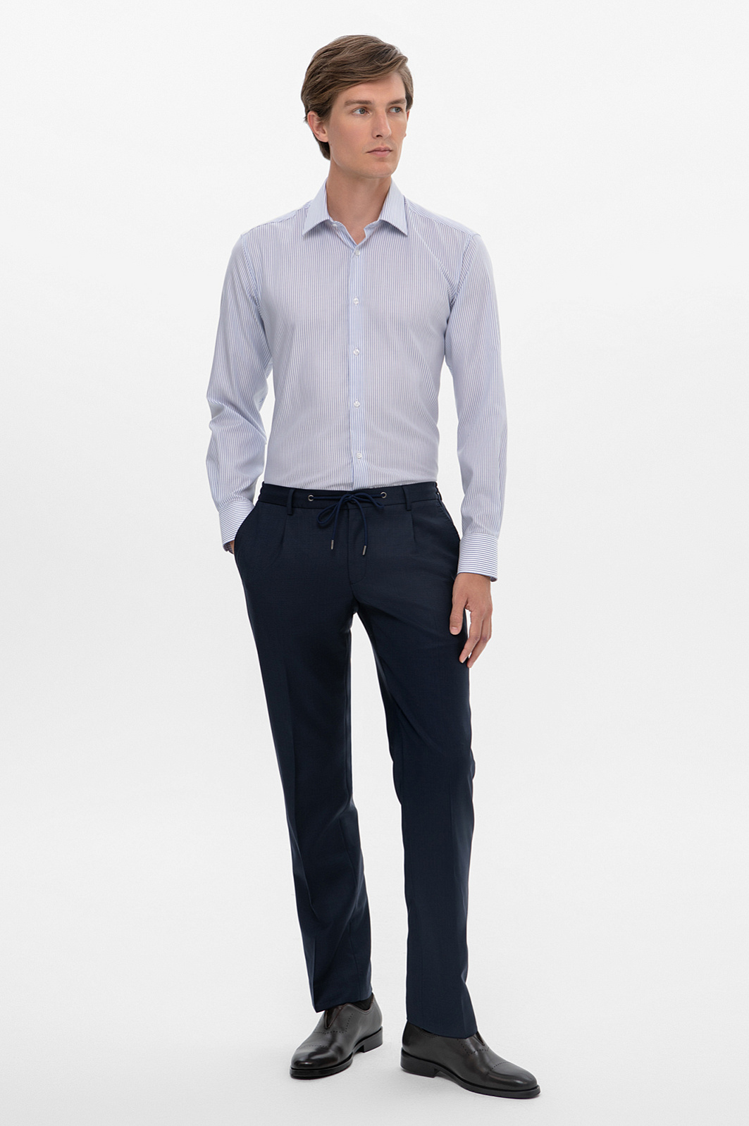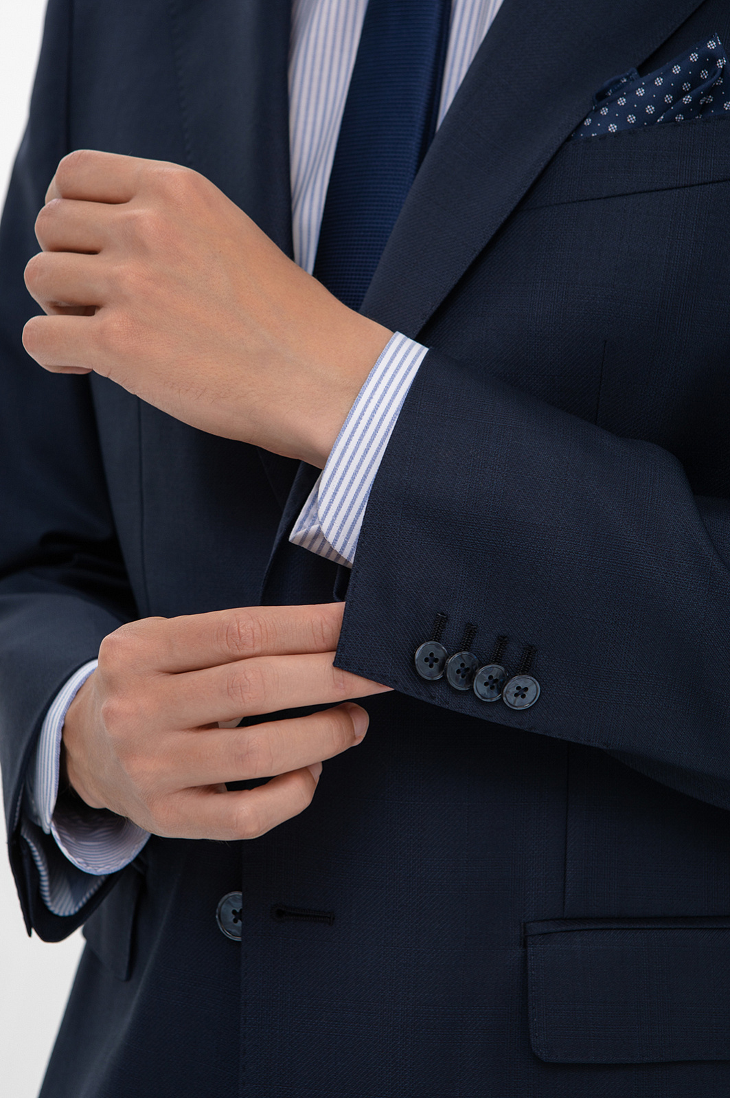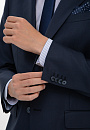 Дизайнеры чувствуют запросы современных мужчин, которым хочется одеваться в классические деловые костюмы, не теряя комфорта. Ответом стала универсальная удобная двойка KANZLER из тонкой шерсти строгого синего оттенка, которая состоит из элегантного однобортного пиджака умеренно свободного кроя с двумя шлицами и слегка зауженных книзу брюк со стрелками на кулиске. Они комфортно сидят на бедрах, посадка регулируется кулиской. Подходят мужчинам любой комплекции. Дорогой костюмный материал создан из премиальной шерсти мериноса Супер 120S. Упругие тонкие волокна поддерживают комфортную для тела температуру, не мнутся и сохраняют безупречную форму ткани.