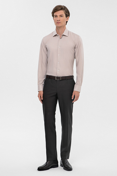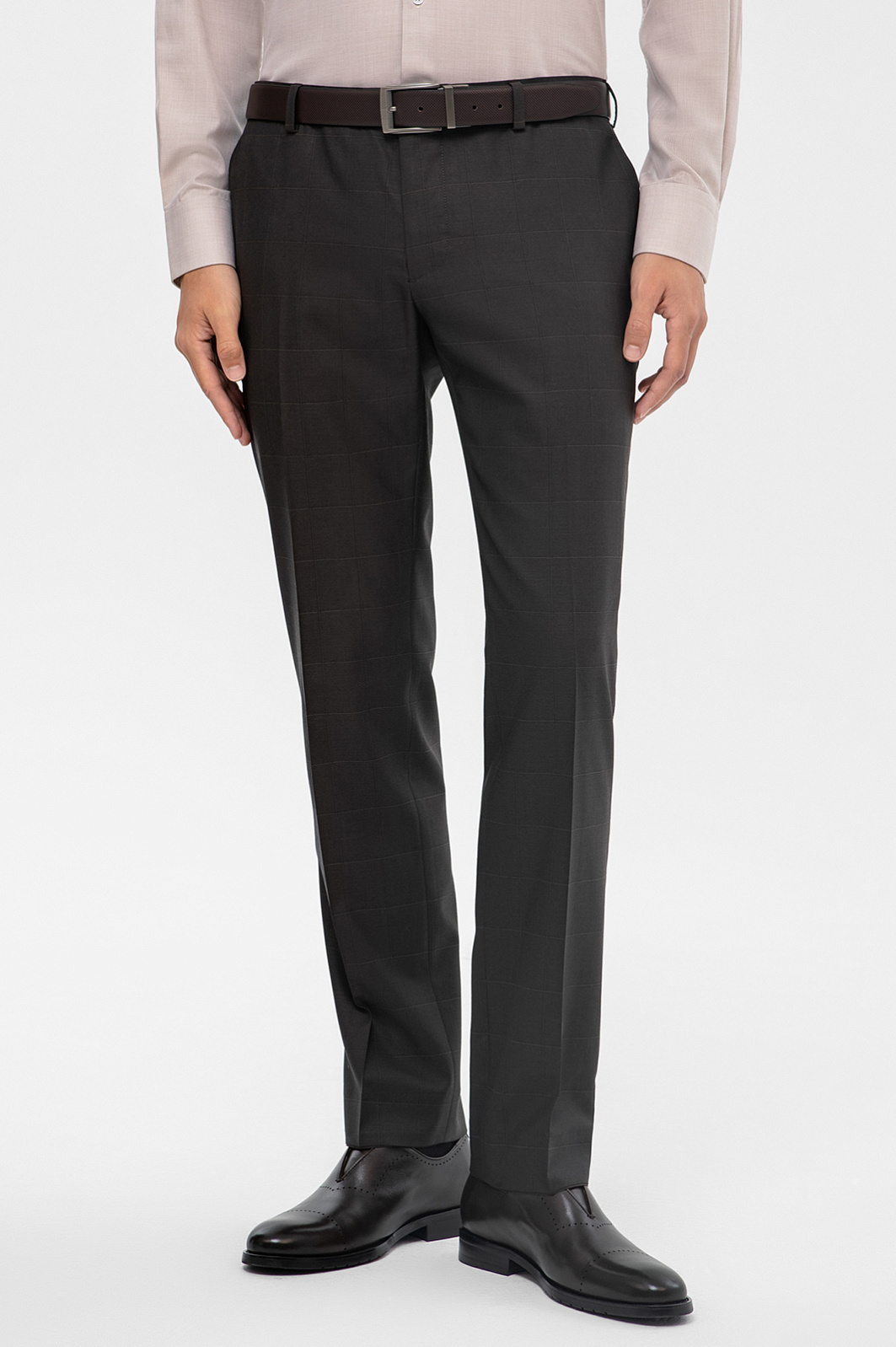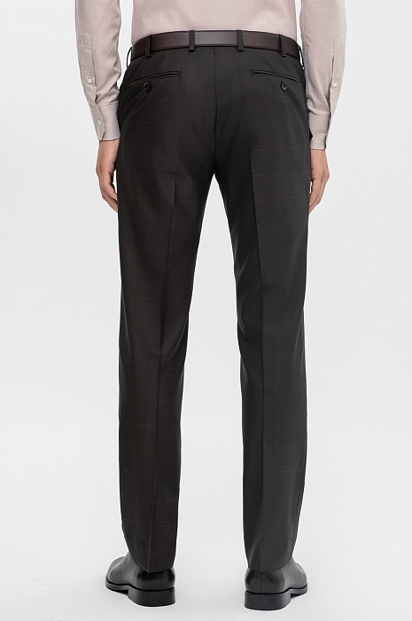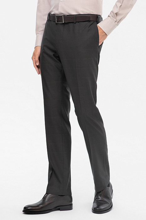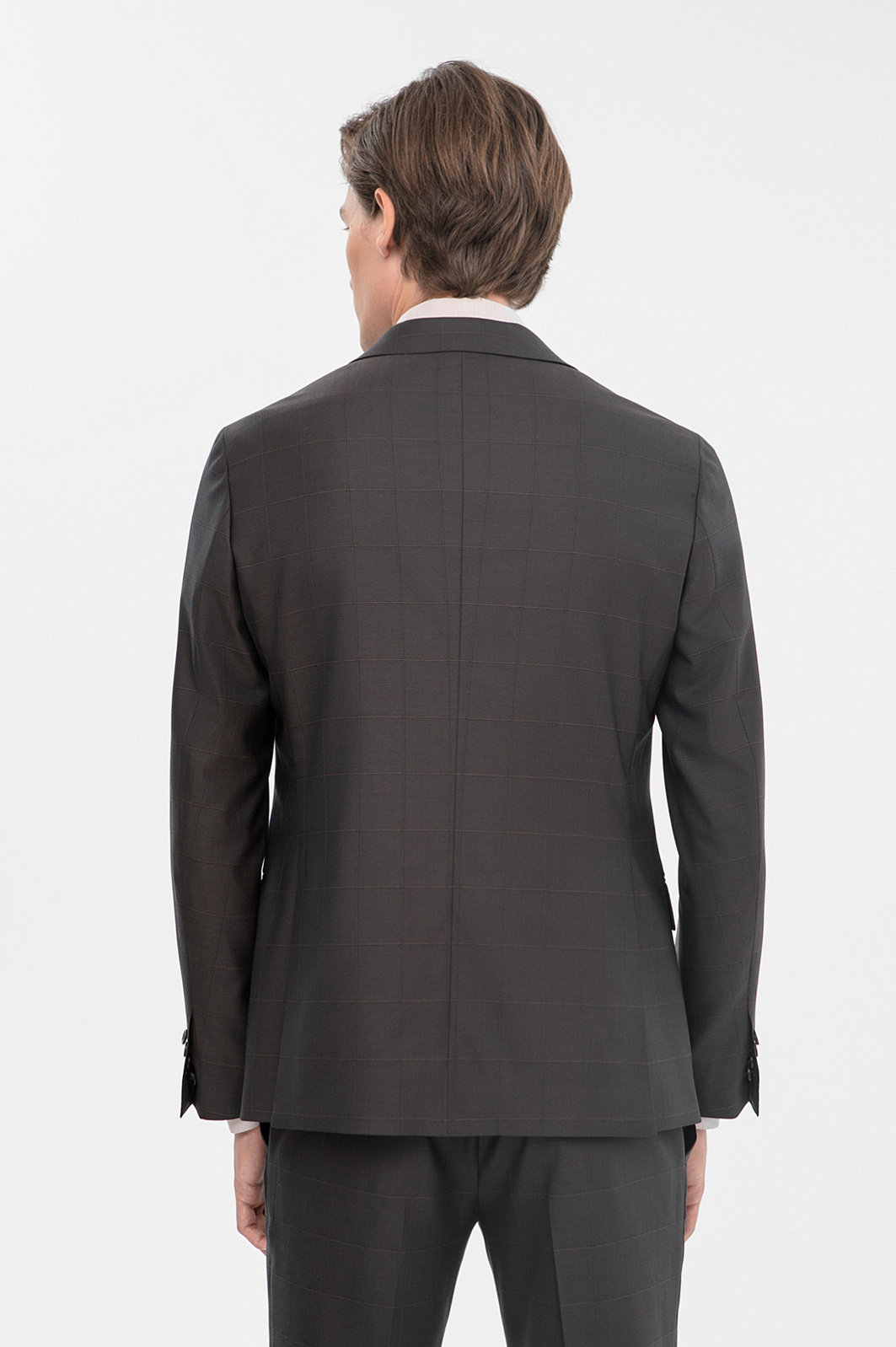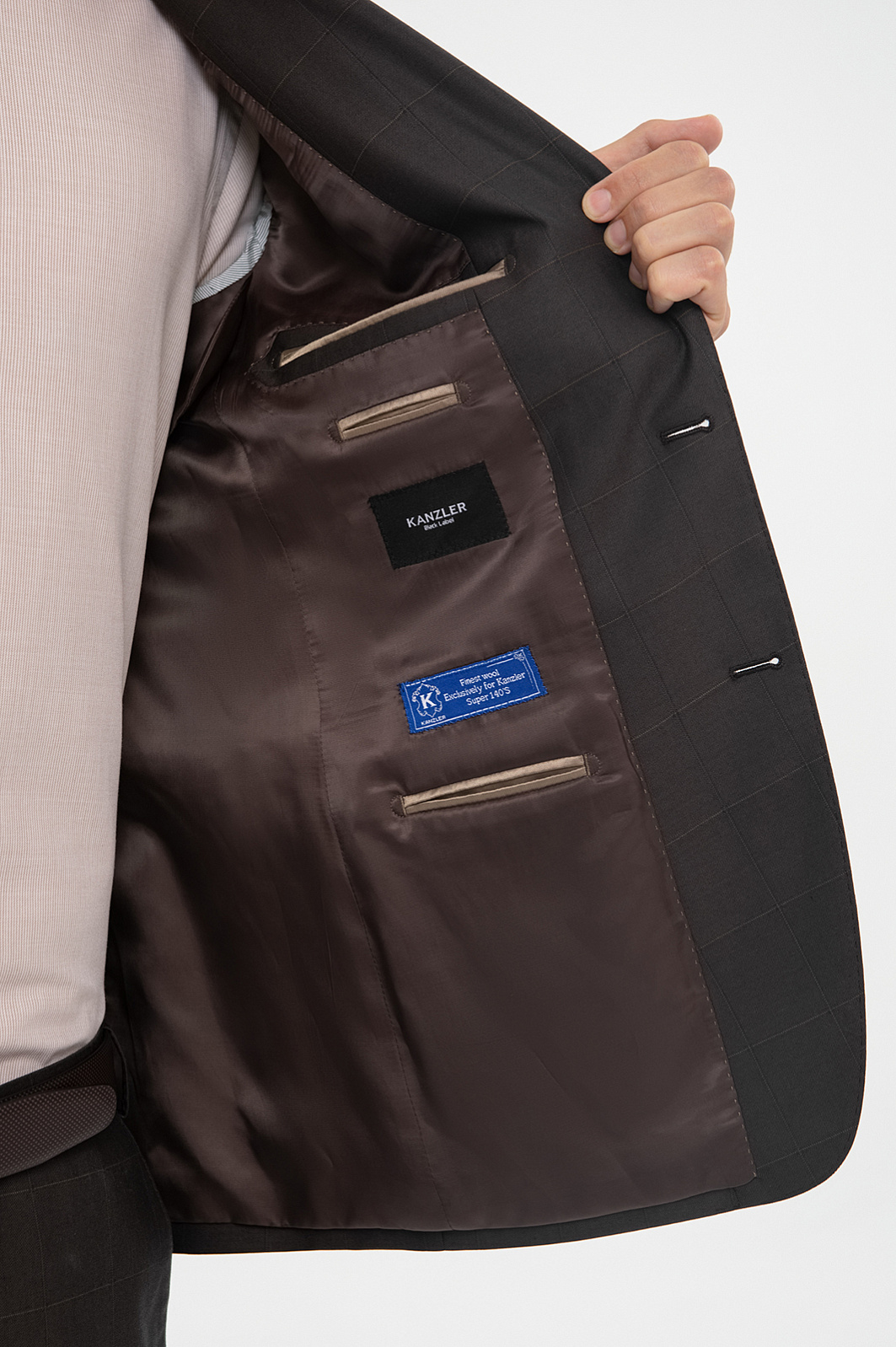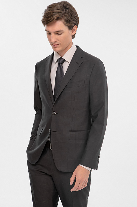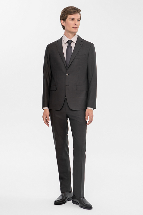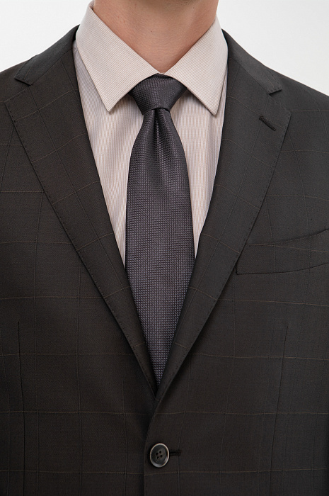 Костюм KANZLER спокойного серо-коричневого оттенка из тонкой шерсти Супер 140S объединяет черты консервативного делового стиля с небольшими вольностями — современным кроем и узором в неброскую тонкую клетку. Двойка состоит из однобортного пиджака с двумя шлицами, пуговицами в тон и брюк со стрелками. Благодаря силуэту slim fit любая фигура вытягивается и не выглядит приземленной. Естественные линии плечевого пояса обеспечивают хорошую посадку. Натуральная ткань мягко облегает тело, намечая основные константы — ширину плеч и линию талии. Слово «Super» и трехзначное число на бирке костюма говорит о том, что для производства материала использовались тонкие волокна шерсти, которые придают ему дорогой вид и поддерживают комфортную для тела температуру и в теплые, и в холодные дни.