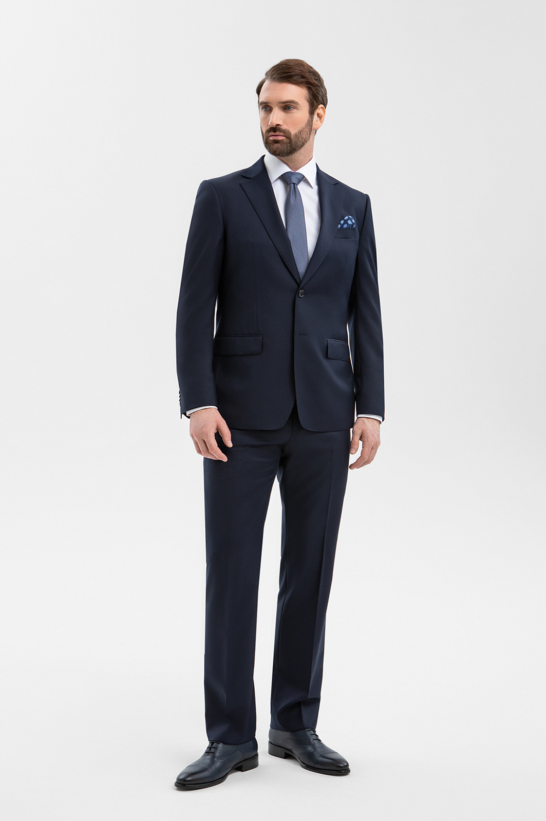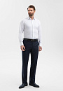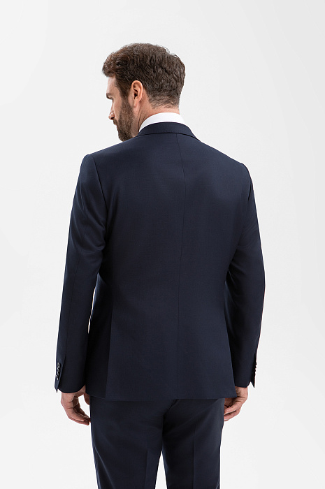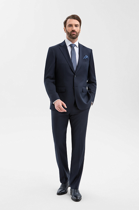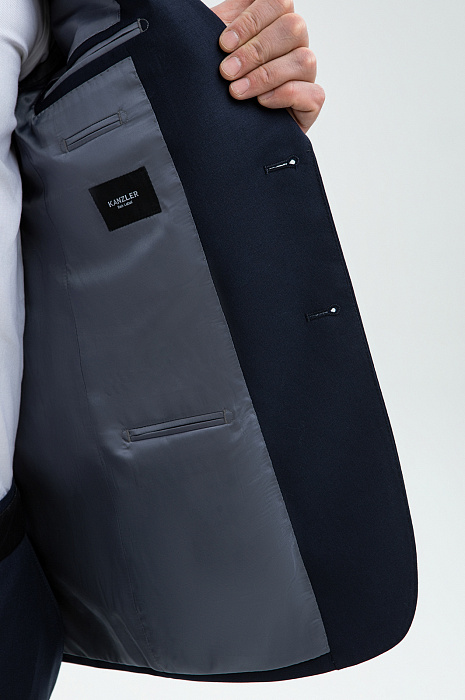 Элегантный тёмно-синий костюм KANZLER из смесовой шерсти мериноса подчёркивает принадлежность к деловому миру, создавая образ лидера и профессионала. Выверенный силуэт, сдержанный цвет и благородная фактура ткани говорят о вкусе и уверенности. Современный слегка зауженный крой костюмной пары сочетаются с традиционными деталями — клапанами на карманах пиджака и стрелками на брюках. В составе высококачественной ткани — шелковистая гипоаллергенная шерсть мериноса, которая бережёт естественное тепло и защищает тело от перегревания, и прочный полиэстер, делающий материал устойчивым к сминанию и износу.