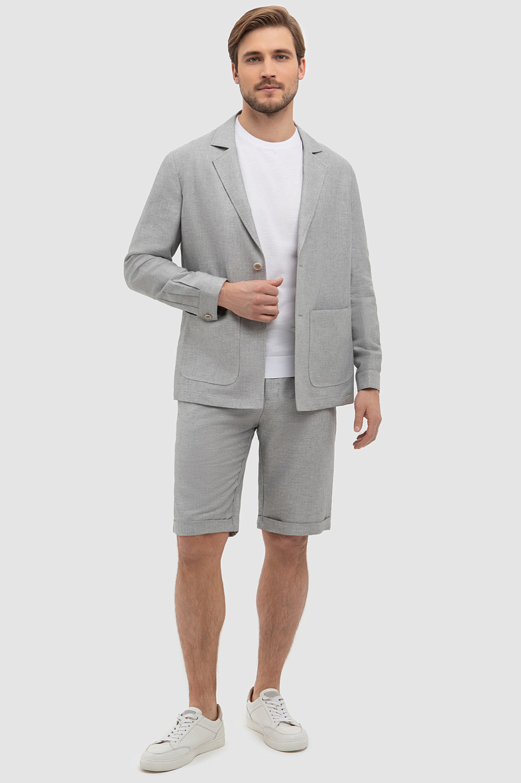Костюм KANZLER изо льна и хлопка олицетворяет изящество и свободу. Благородный светло-серый оттенок создает непринужденный, но элегантный образ. Натуральный материал дарит ощущение свежести, обеспечивая идеальный микроклимат и в жаркий, и в прохладный день. Изысканный однобортный пиджак с боковыми шлицами не стесняет движений, даря ощущение легкости и свободы. бермуды с защипами и манжетами-отворотами привносят нотку неформальности. Костюм создан для современного мужчины, предпочитающего быть в центре внимания, оставаясь собой.