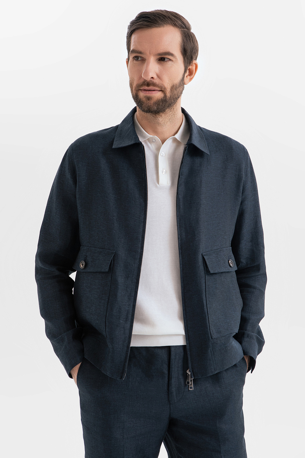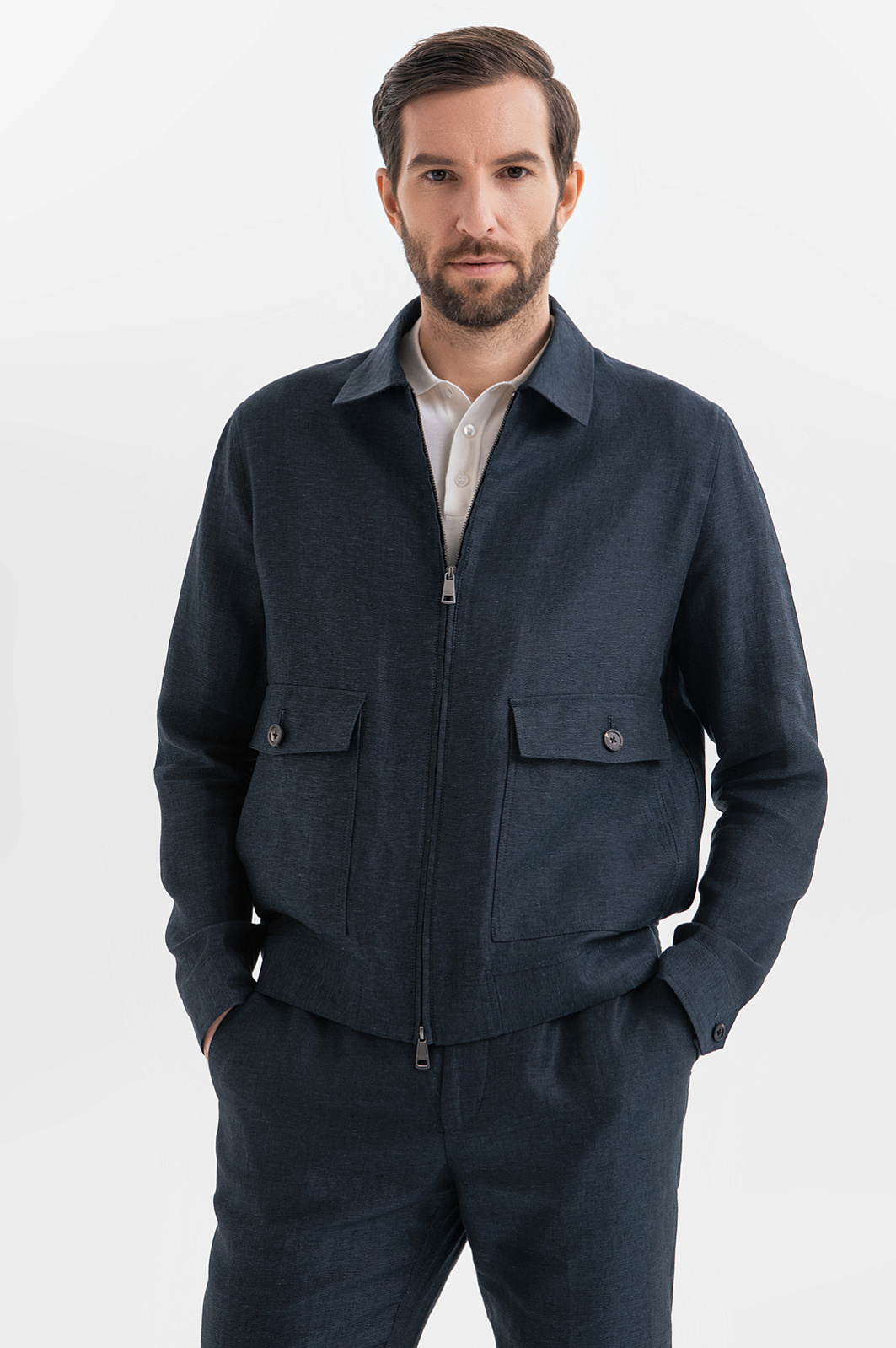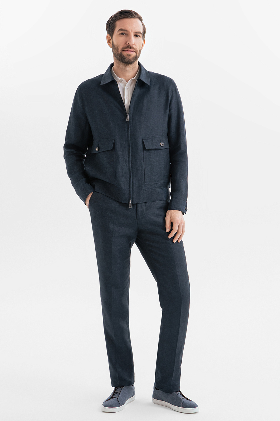 Льняной костюм KANZLER расскажет о вашем безупречном стиле и индивидуальности без слов. Куртка и брюки выполнены из 100-процентного льна в глубоком синем оттенке. Натуральная ткань, словно вторая кожа, дышит, мгновенно отводит влагу и обеспечивает прохладу в жаркий день, делая этот комплект идеальным спутником для городских прогулок, встреч и путешествий. Каждая деталь ансамбля продумана до мелочей. Куртка на молнии с отложным воротником и накладными карманами добавляет образу урбанистический характер, а облегченный крой без подкладки дарит ощущение невесомости. Брюки слегка зауженного кроя балансируют между строгостью и расслабленностью, а стрелки визуально вытягивают силуэт. Дополните образ светлым поло с коротким рукавом и кедами или лоферами.