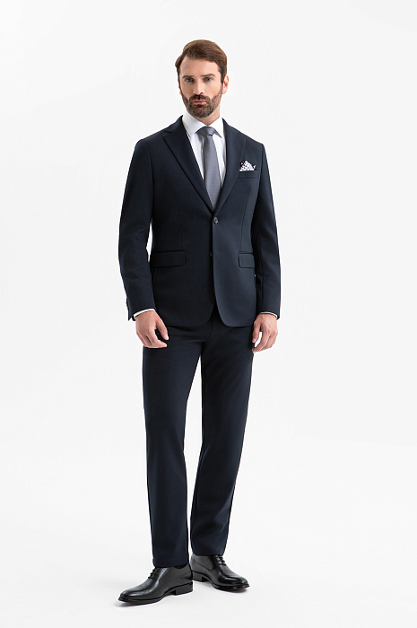 Современный элегантный костюм KANZLER благородного сине-серого оттенка — выверенный баланс традиций и инноваций. Практичная пара сокращает утренние сборы и делает офисную жизнь более комфортной. Костюм составлен из облегчённого однобортного пиджака без подкладки с накладными карманами и брюк слегка зауженного кроя с кулиской и резинкой на поясе. Костюм создан из практичного технологичного полотна. В составе — прочный полиэстер с добавлением эластичного спандекса. Сочетание современных волокон делает ткань устойчивой к сминанию, лёгкой в уходе и адаптирующейся к индивидуальным особенностям фигуры.