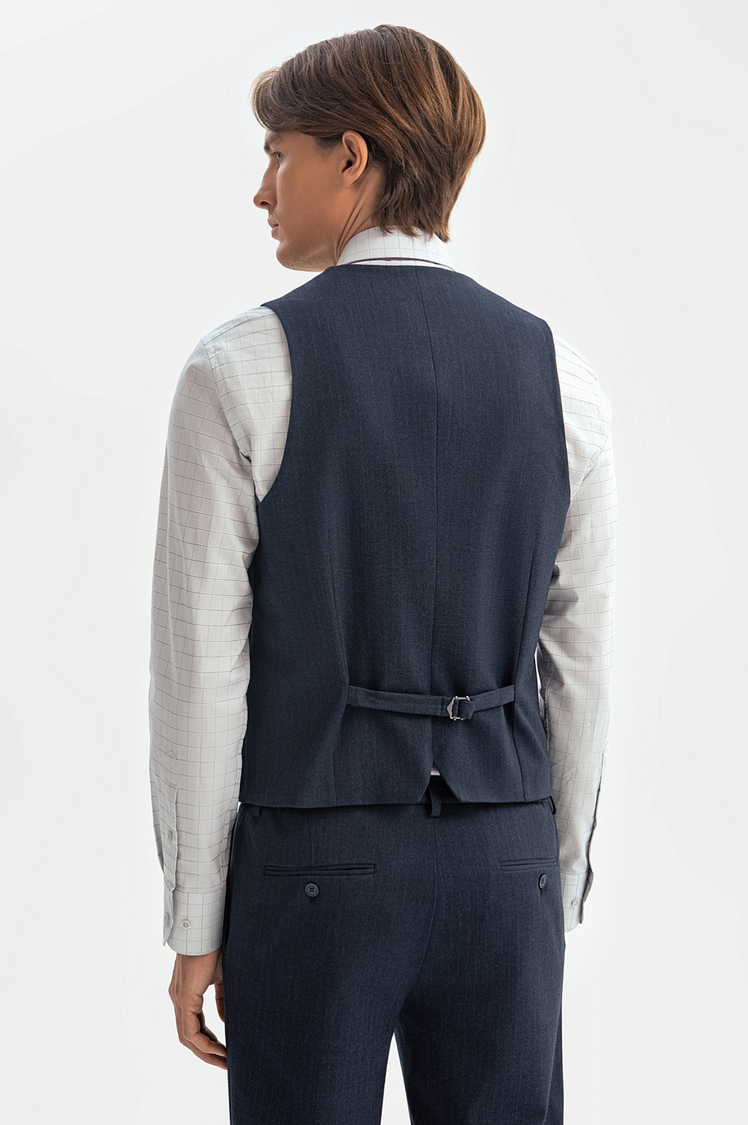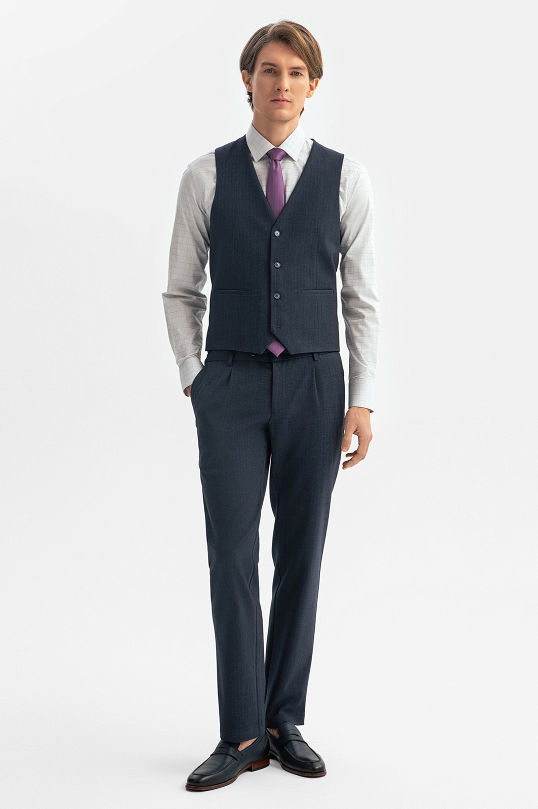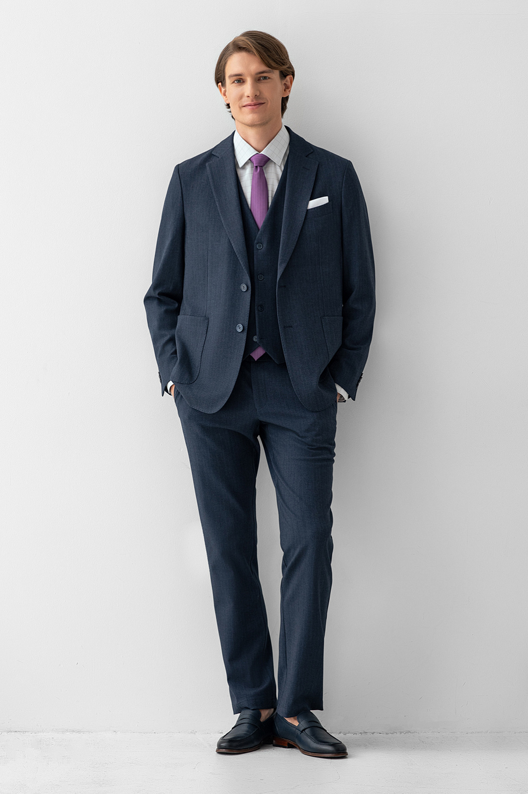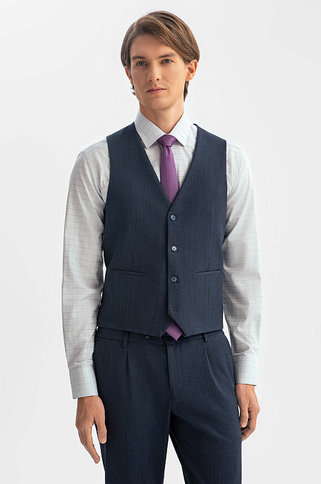 Элегантный костюм-тройка KANZLER благородного серо-синего оттенка состоит из однобортного пиджака, жилета с хлястиком и брюк на кулиске. Костюмный ансамбль создает собранный деловой образ, который идеально подойдет для офиса и торжественных мероприятий. Умеренно свободный крой пиджака не стесняет движений и великолепно смотрится на фигуре любого типа. Изысканный жилет в неформальных случаях может жить самостоятельной жизнью, надетый поверх формальной сорочки. Слегка зауженный силуэт брюк визуально вытягивает фигуру. Кулиска на линии талии позволяет регулировать степень прилегания. Высокотехнологичная прочная смесовая ткань состоит из трех видов волокон, которые не сминаются и не боятся загрязнений.