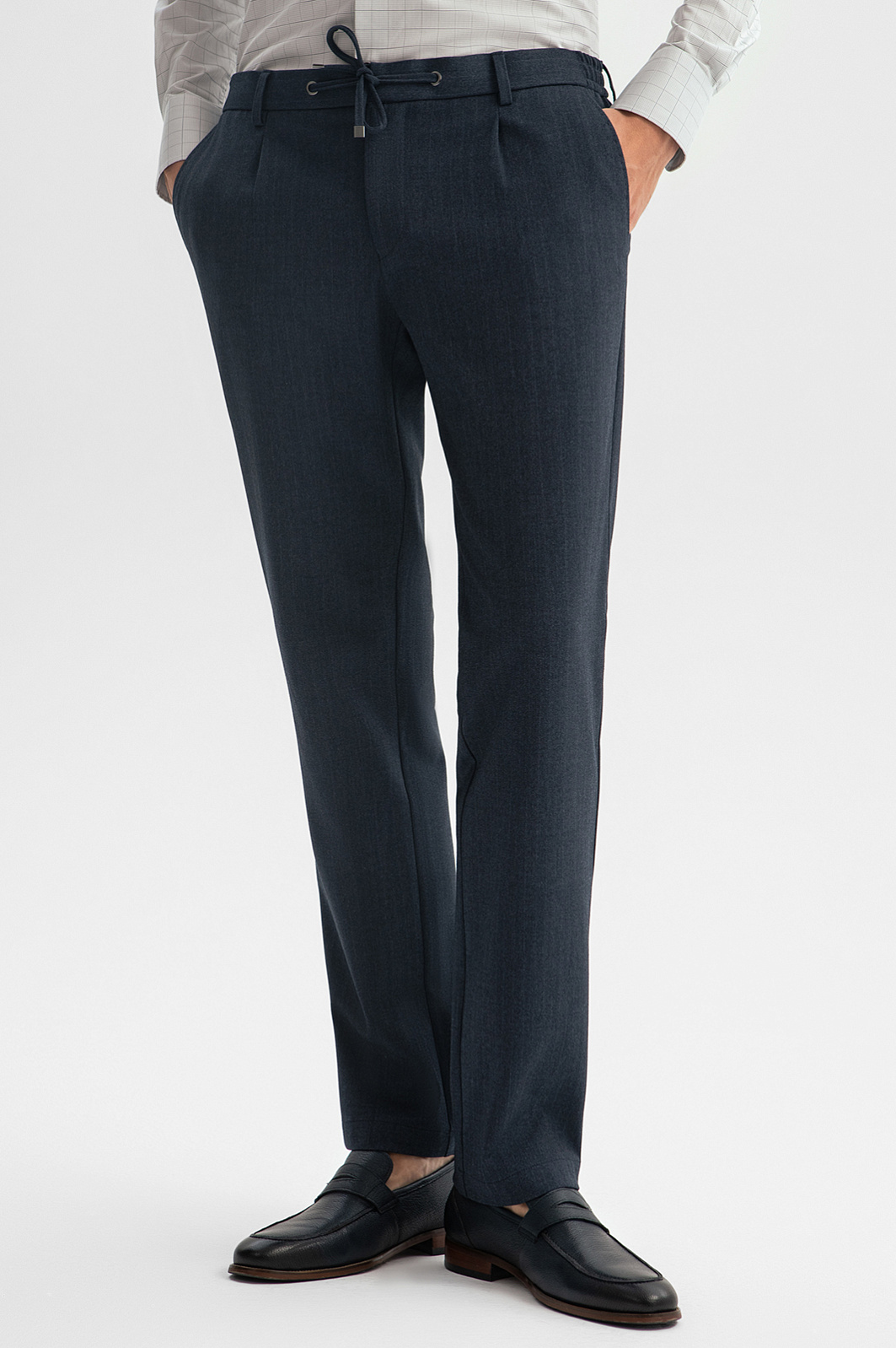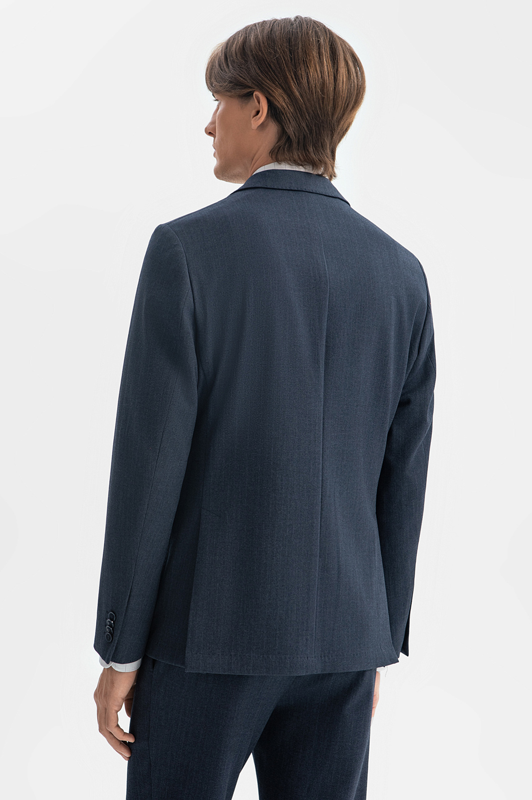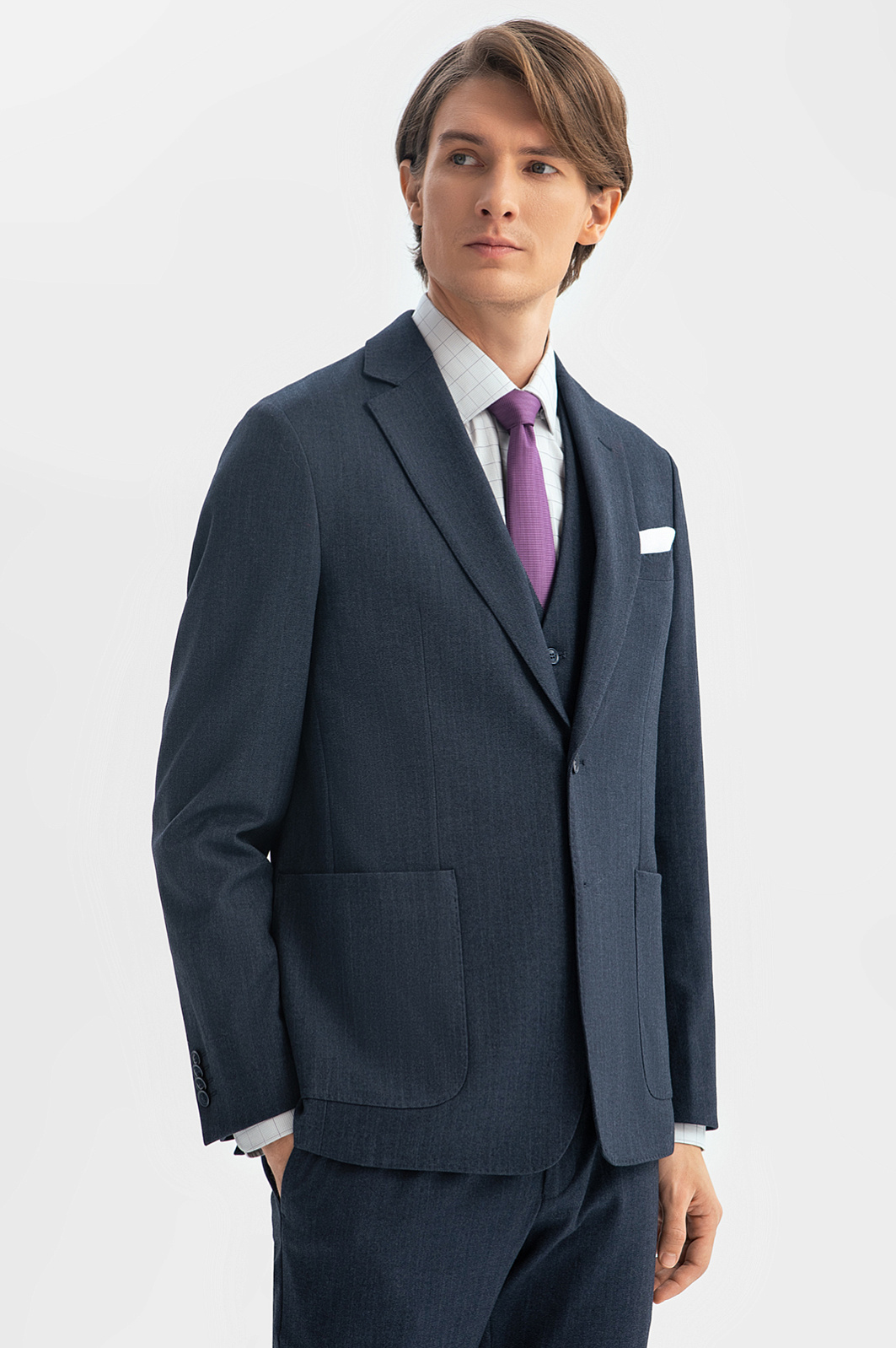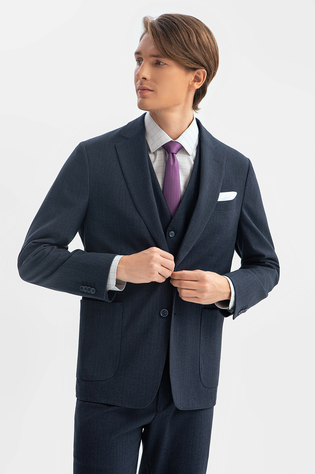Элегантный костюм-тройка KANZLER благородного серо-синего оттенка состоит из однобортного пиджака, жилета с хлястиком и брюк на кулиске. Костюмный ансамбль создает собранный деловой образ, который идеально подойдет для офиса и торжественных мероприятий. Умеренно свободный крой пиджака не стесняет движений и великолепно смотрится на фигуре любого типа. Изысканный жилет в неформальных случаях может жить самостоятельной жизнью, надетый поверх формальной сорочки. Слегка зауженный силуэт брюк визуально вытягивает фигуру. Кулиска на линии талии позволяет регулировать степень прилегания. Высокотехнологичная прочная смесовая ткань состоит из трех видов волокон, которые не сминаются и не боятся загрязнений.