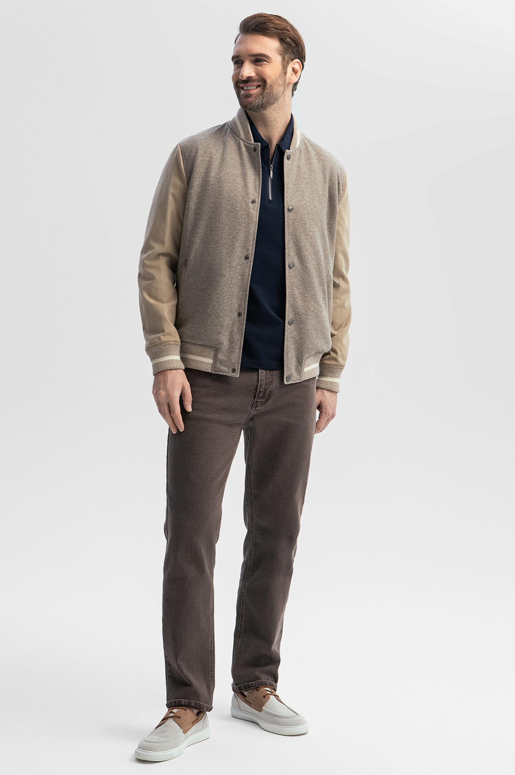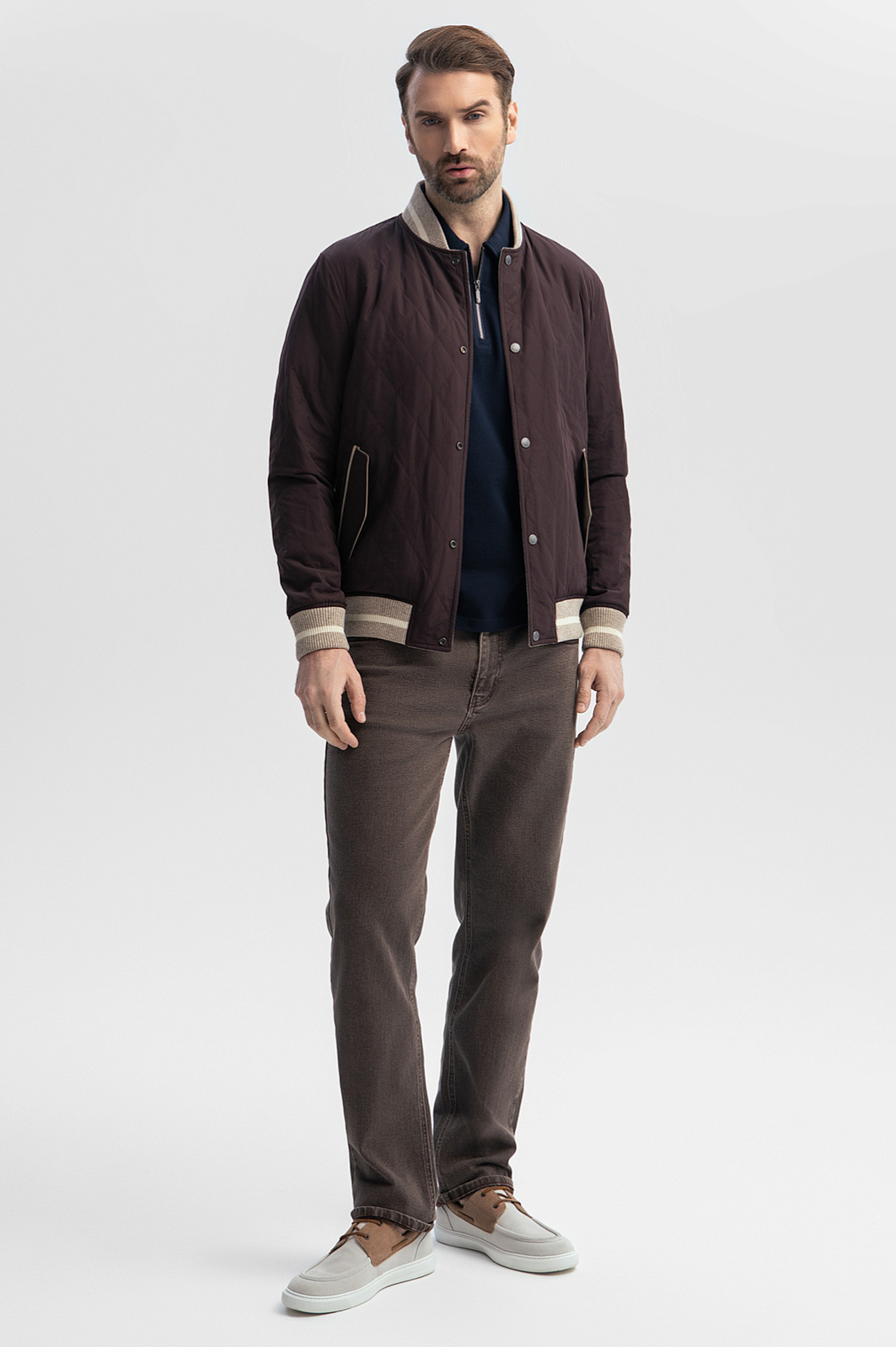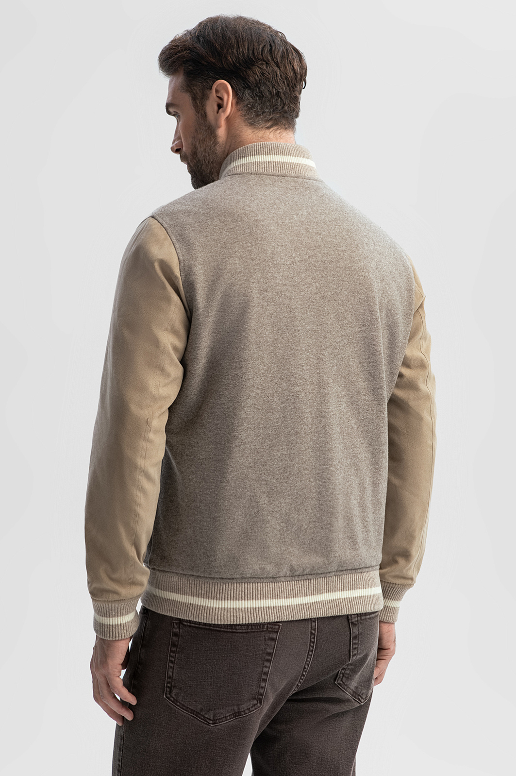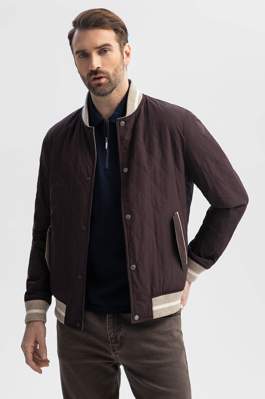 Роскошный двусторонний бомбер KANZLER — стильная, удобная и функциональная верхняя одежда из лимитированной коллекции, все модели которой отшиваются из дорогих изысканных тканей. Демисезонную куртку можно носить на обе стороны, руководствуясь настроением и погодными условиями. Одна сторона — серая, с бежевыми рукавами. Основная часть сшита 100-процентной шерсти итальянской мануфактуры Vitale Barberis Canonico, которая в 1663 году поставляла ткани для костюмов герцога Савойского, а пару лет назад отмечала свое 360-летие. Это немнущийся воздухопроницаемый материал, который поддерживает комфортную температуру и сохраняет тепло. Другая сторона куртки — стеганая, из прочной непродуваемой полиэстеровой ткани оттенка горького шоколада. Акцентными деталями служат бежевые с белой полосой фактурные трикотажные резинки снизу, на воротнике и манжетах. Параметры модели: рост 189, 102-80-99 Размер на модели: 50