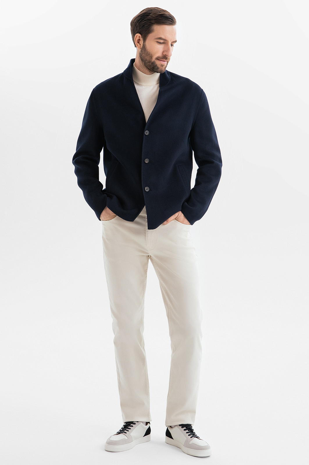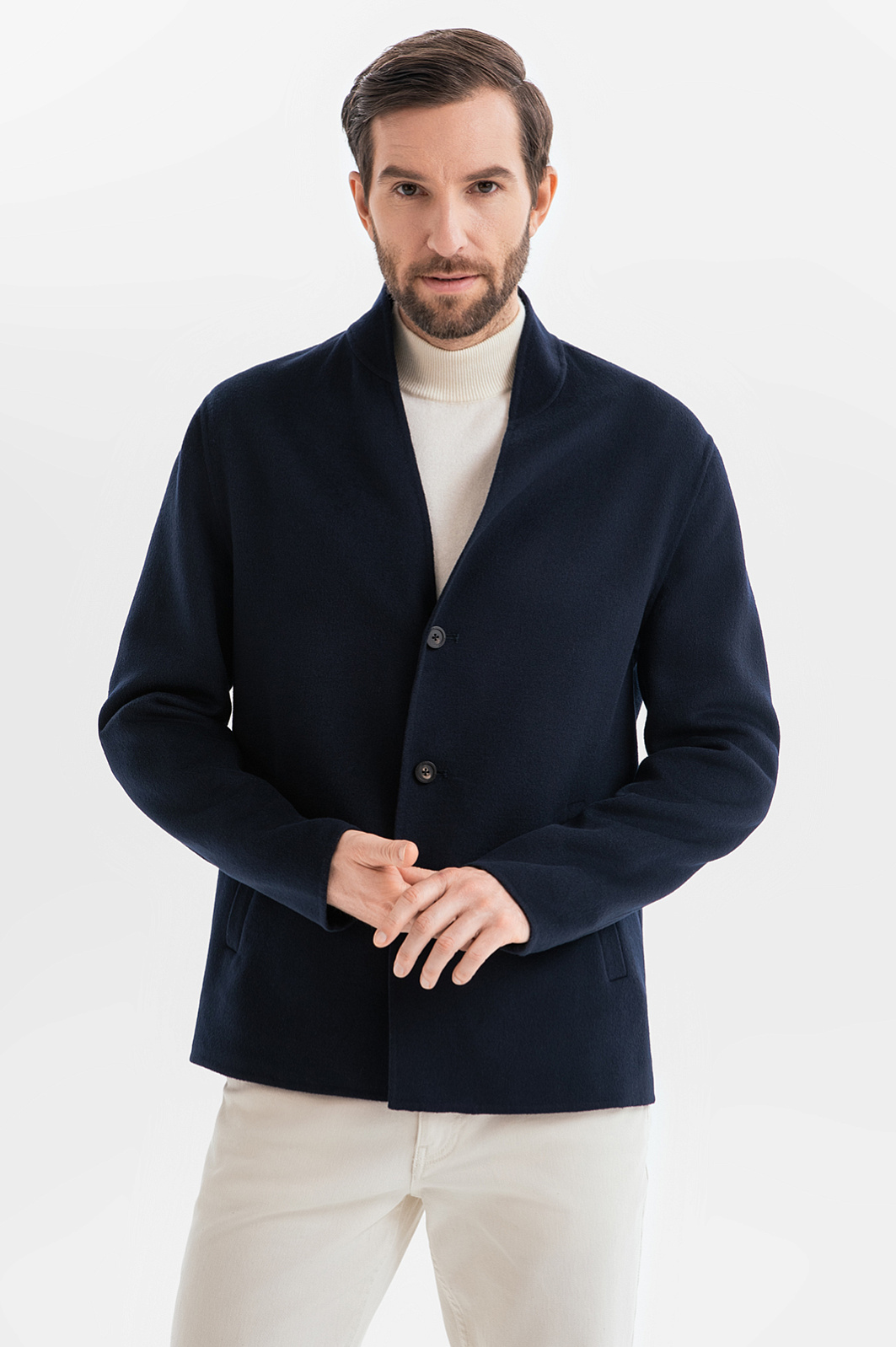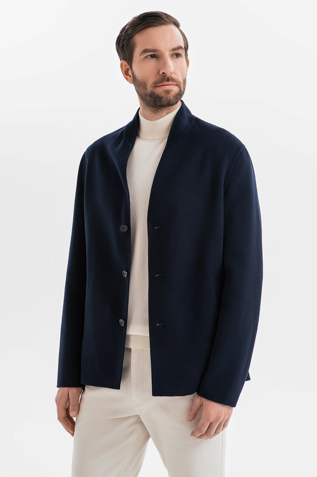 Короткое пальто из смесовой шерсти KANZLER в глубоком синем оттенке – образец изысканного и расслабленного европейского стиля. Минималистичная и легкая модель станет идеальным завершением образа мужчины, стремящегося подчеркнуть свою индивидуальность. Премиальный состав материала – ода роскоши, практичности и комфорту. Шерсть гарантирует тепло, нейлон обеспечивает прочность, сохранение формы и устойчивость к износу, а вискоза дарит мягкость и гладкость. Динамичность образу придают стильный воротник-стойка и однобортная застежка на пуговицы. Модель дополнена двумя боковыми карманами. Внутри рукавов – подкладка из полиэстера и вискозы, что гарантирует свободу движений и облегчает надевание. Параметры модели: рост 187, 99-81-97 Размер на модели: 50
