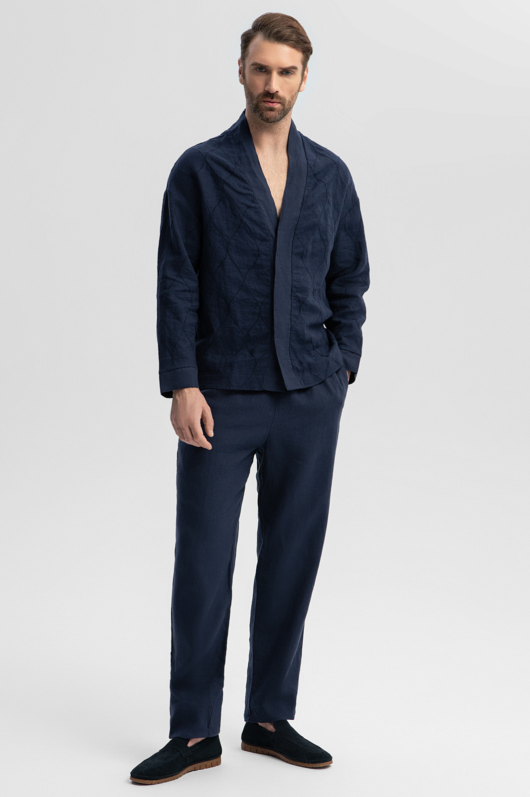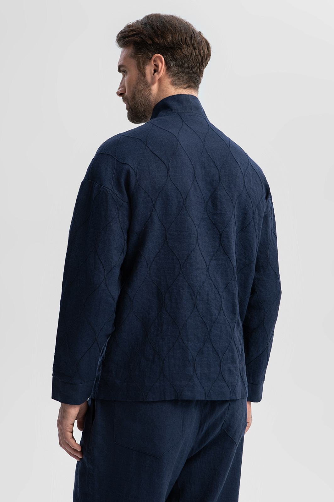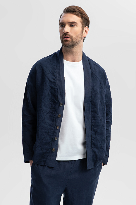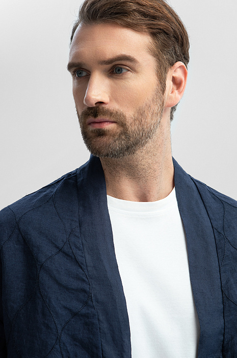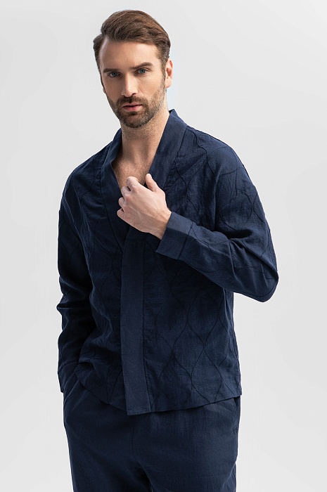 Дизайн пиджака KANZLER глубокого синего оттенка изо льна из лимитированной коллекции вдохновлен одеждой японских самураев. Отсылками служат простроченный орнамент, свободный прямой крой и широкая планка, прикрывающая ряд пуговиц. Свободный пиджак можно носить как рубашку. Гипоаллергенная льняная ткань — лучший выбор для теплых дней. Гладкие волокна льна обладают свойством охлаждать тело и отводить лишнюю влагу. Легкая проницаемая структура материала обеспечивает циркуляцию воздуха и поддерживает оптимальную температуру. Параметры модели: рост 189, 102-80-99 Размер на модели: 50