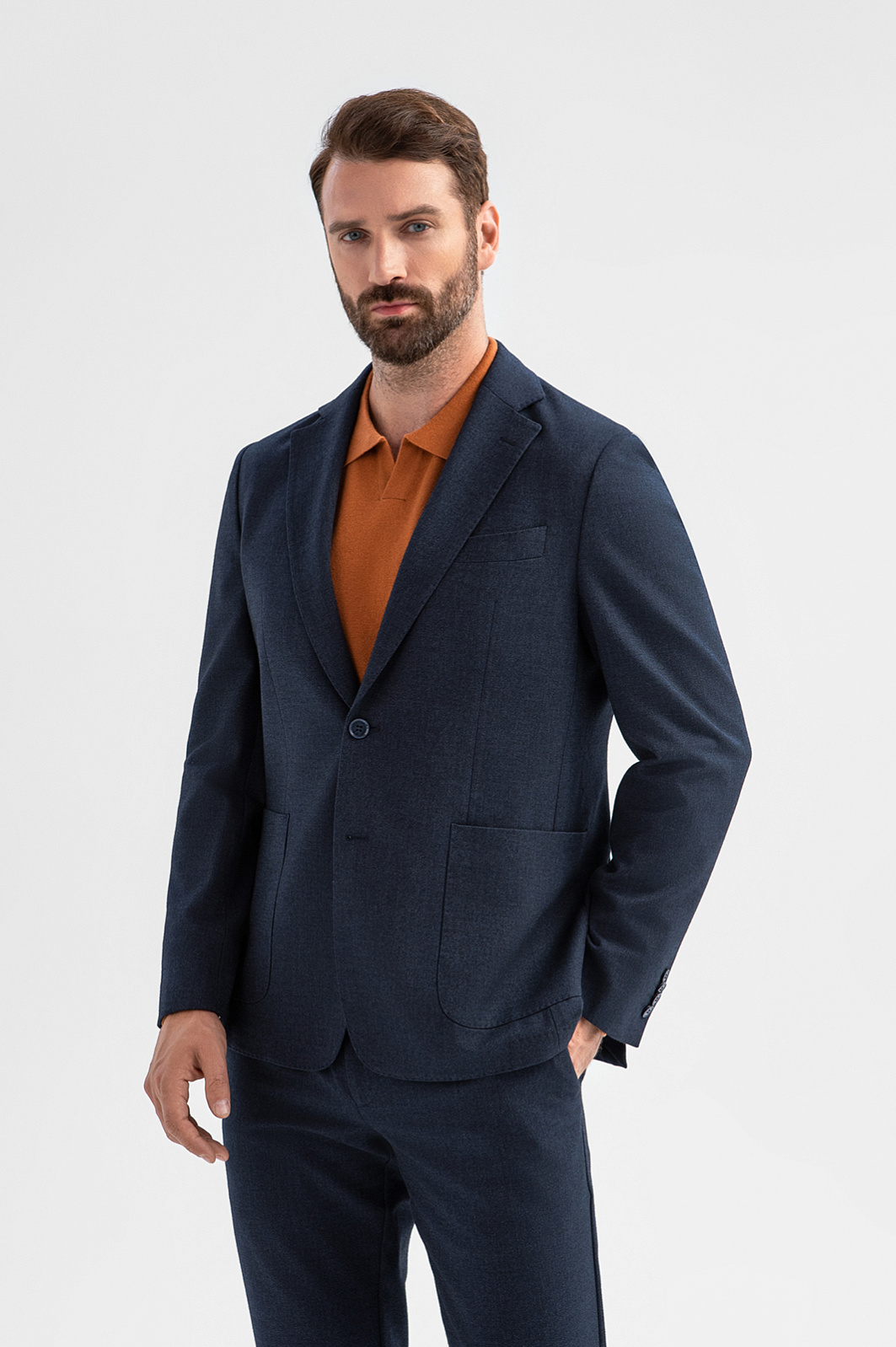 Однобортный пиджак KANZLER спокойного синего цвета — современный вариант для тех, кто ценит практичность и элегантность в повседневной одежде. Прилегающий крой подчёркивает мужественность фигуры, а накладные карманы придают модели актуальный вид. Облегчённая конструкция без подкладки позволяет носить пиджак в любое время года. Широкий отворот с внутренней стороны имеет дополнительные карманы для хранения необходимых мелочей. Две шлицы сзади обеспечивают комфорт при движении. Смесовый материал отличается мягкостью, износостойкостью и лёгким уходом: ткань сохраняет форму, не требует сложной чистки и долго выглядит безупречно. Параметры модели: рост 189, 102-80-99 Размер на модели: 50