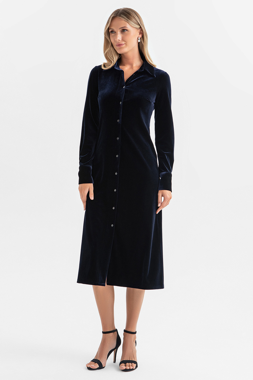 Нежная и роскошная фактура бархата в сочетании с благородным и глубоким темно-синим цветом выводят классическое платье-рубашку на новый уровень. Модель создает утонченный и одновременно комфортный образ, который отлично подойдет как для работы, так и для вечернего выхода и особых случаев. Вертикальный ряд пуговиц визуально вытягивает силуэт и позволяет регулировать степень открытости. Платье легко стилизовать под разное настроение — от романтического до делового. Наши стилисты предлагают дополнить модель классическими туфлями на каблуке, босоножками или коричневыми сумкой, ремнем и сапогами. Параметры модели: рост 180, 87-61-91 Размер на модели: S