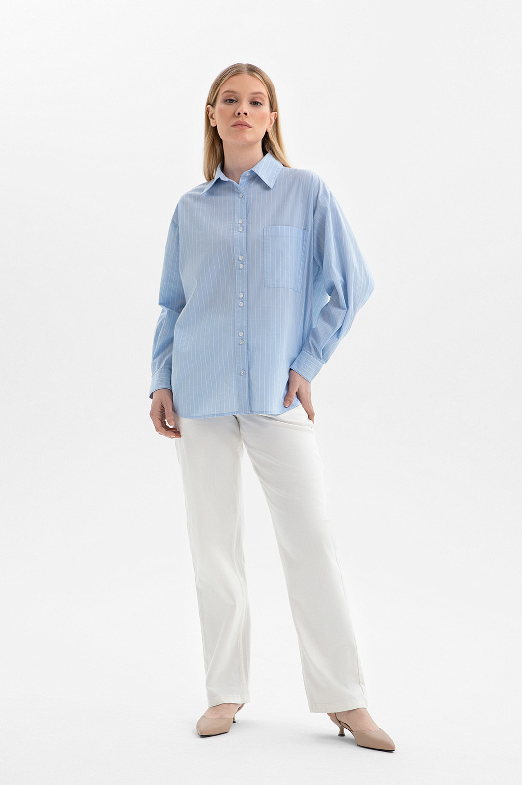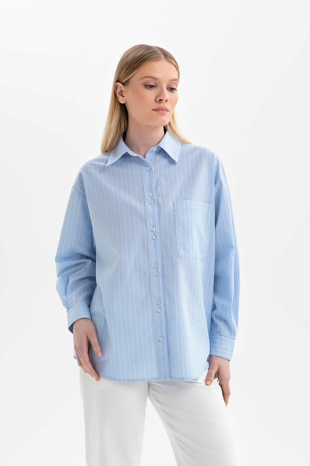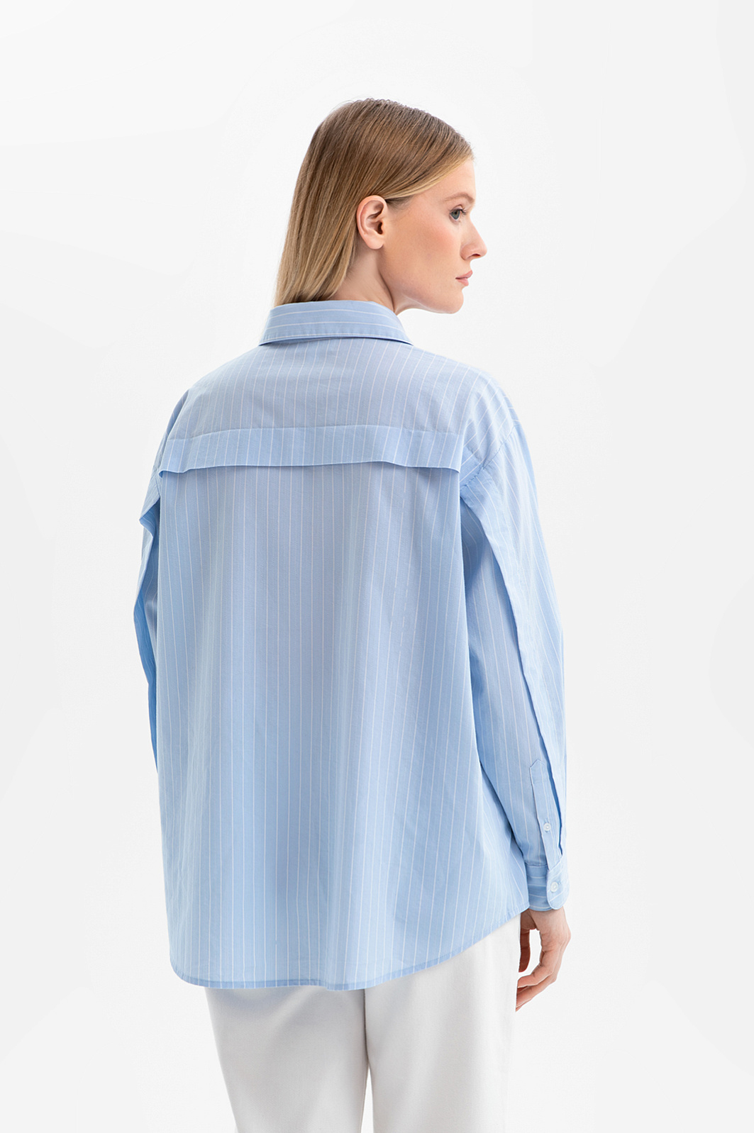 Голубая рубашка KANZLER из хлопка с нагрудным карманом — дизайнерская вещь в непринуждённом повседневном стиле, в котором элегантность гармонично сочетаются с естественностью. В свободные дни её приятно надеть на прогулку по городу: неспешно исследовать тихие утренние улицы и наблюдать за прохожими, устроившись на террасе кафе с чашечкой кофе. Модель прямого кроя изготовлена из мягкого натурального хлопка и украшена тонкими белыми полосками, которые добавляют образу лёгкость. Современное звучание придают детали — расположенные вертикальными парами пуговицы и широкая прошитая складка на спинке, которая переходит на рукава. В составе материала — чистый хлопок. Его натуральные гипоаллергенные волокна отличаются высокой воздухопроницаемостью и способностью поддерживать комфортный микроклимат в течение дня.