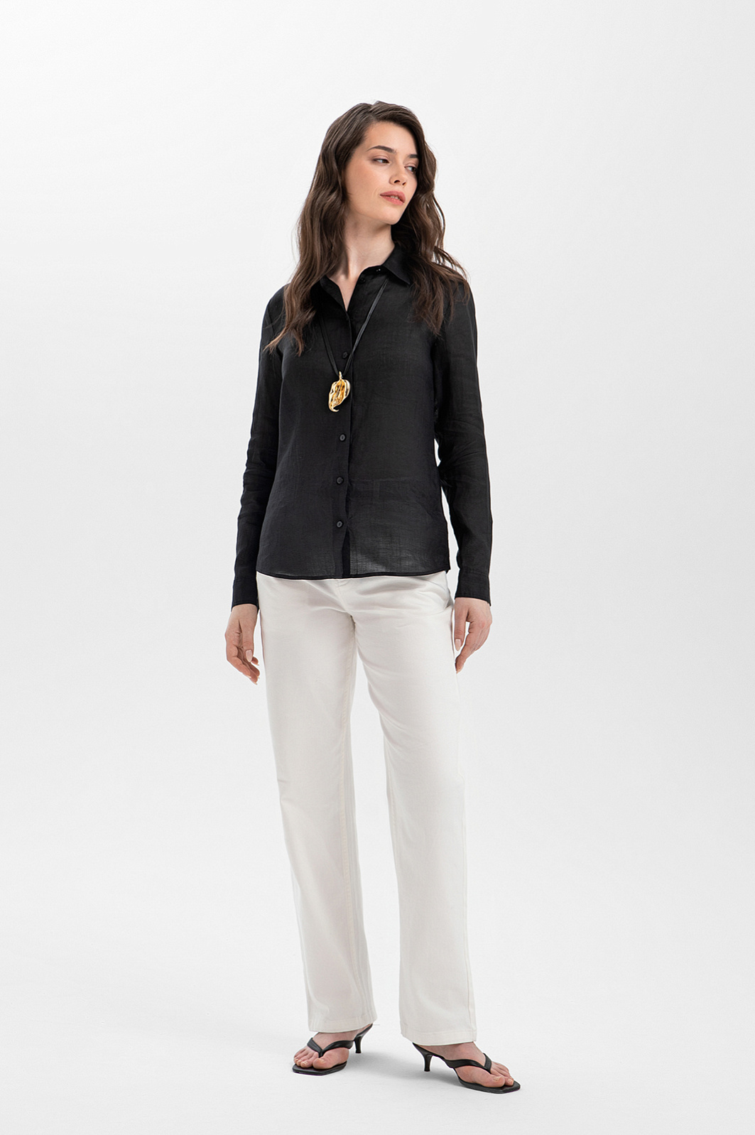 Чёрная рубашка KANZLER из рами — элегантная и универсальная модель, которая легко впишется как в офисный гардероб, так и в повседневные аутфиты для свободного времени. Носите её заправленной в юбку или брюки для создания лаконичного силуэта или оставляйте навыпуск — для более расслабленного или вечернего образов. Сочетание лаконичного кроя и невесомой ткани с деликатной прозрачностью выглядит невероятно женственно. Естественная структура полотна из рами придаёт вещи благородную фактурность и выразительность. Натуральные волокна, которые получают из стеблей одноимённого растения, обладают прочностью, воздухопроницаемостью и гипоаллергенными свойствами. Такая ткань легко сохраняет форму и практически не подвержена усадке.