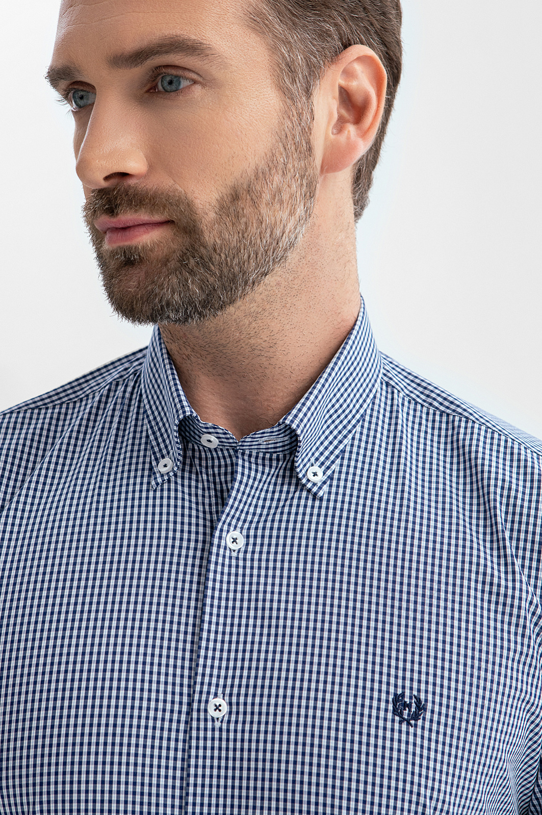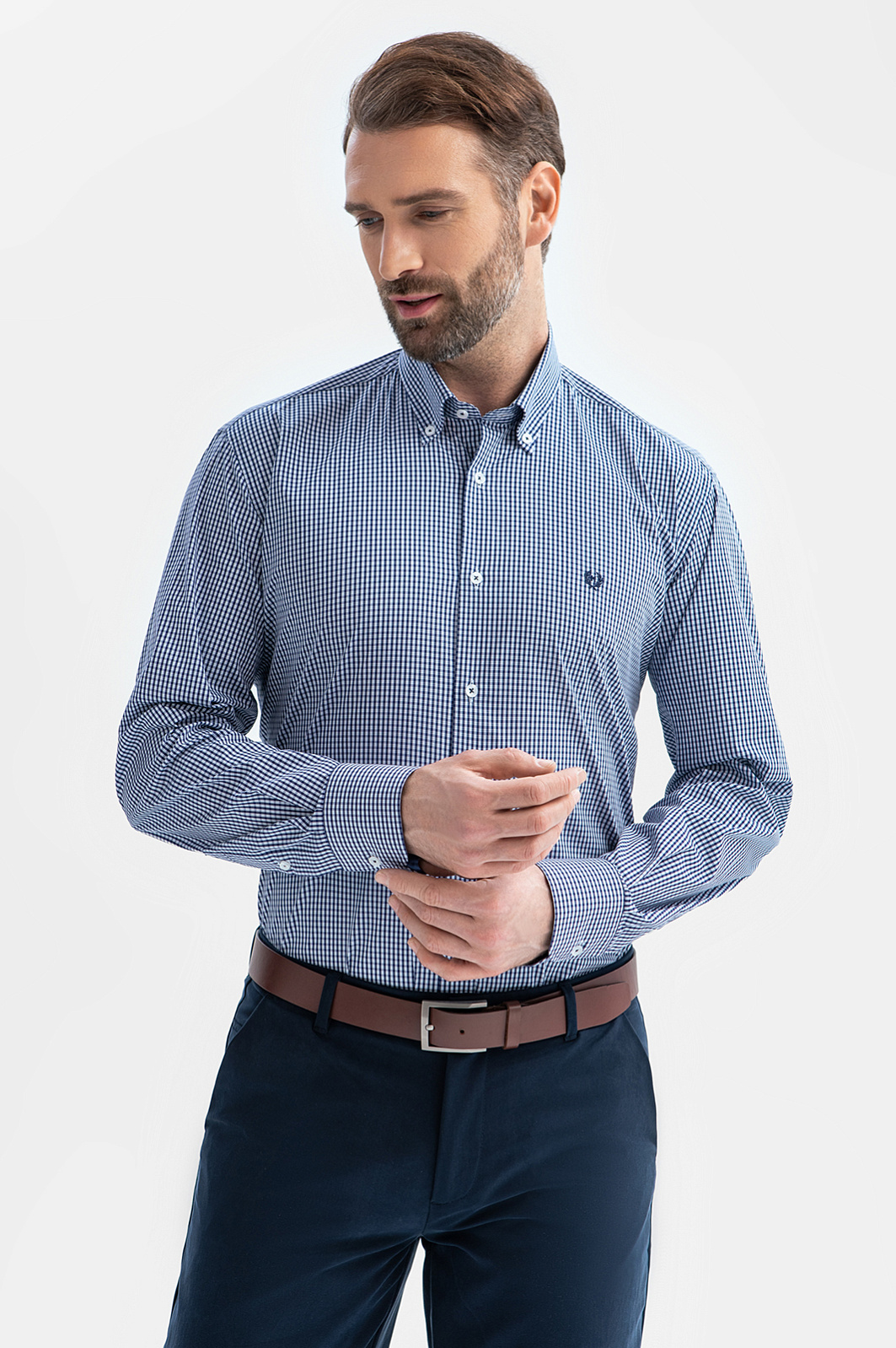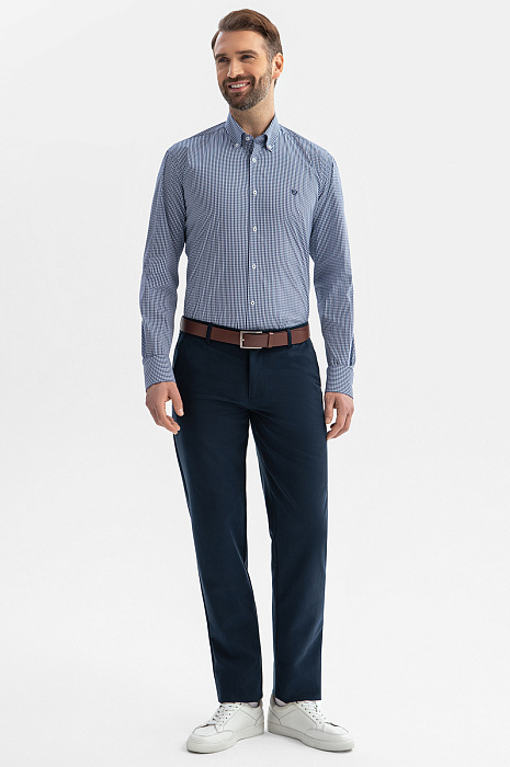 Сорочка KANZLER из эластичной хлопковой ткани в мелкую синюю клетку привнесет легкость и свежесть в повседневный образ. Она подойдет для офиса с нестрогим дресс-кодом и отдыха. Модель украшает небольшая фирменная вышивка на груди. Слегка облегающий крой стройнит и придает сорочке изысканность. Мягкая ткань состоит из натуральных гипоаллергенных волокон хлопка (71%) с добавлением нейлона и спандекса. Материал поддерживает комфортную для тела температуру, не раздражает кожу даже при длительном ношении и отличается практичностью — хорошо держит форму в течение всего дня и не мнется. Параметры модели: рост 189, 102-80-99 Размер на модели: 40
