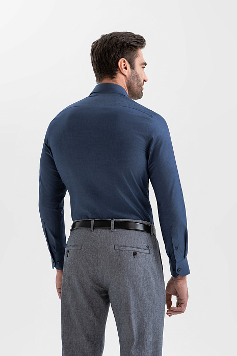 Сорочка KANZLER сумеречно-синего оттенка — воплощение сдержанной элегантности, шика и безупречного вкуса. Глубокий благородный цвет гармонично сочетается как с деловыми костюмами, так и с менее формальными повседневными вещами. Зауженный крой мягко обрисовывает контуры тела. Французская планка подчёркивает лаконичную простоту модели. Натуральный материал произведён старинной итальянской мануфактурой Tessitura Carlo Bassetti, которая специализируется на производстве роскошных рубашечных тканей. Гипоаллергенное полотно из хлопка (96%) отличается мягкостью и воздухопроницаемостью. Добавление эластана (4%) придаёт ему лёгкую эластичность и помогает сохранять форму.